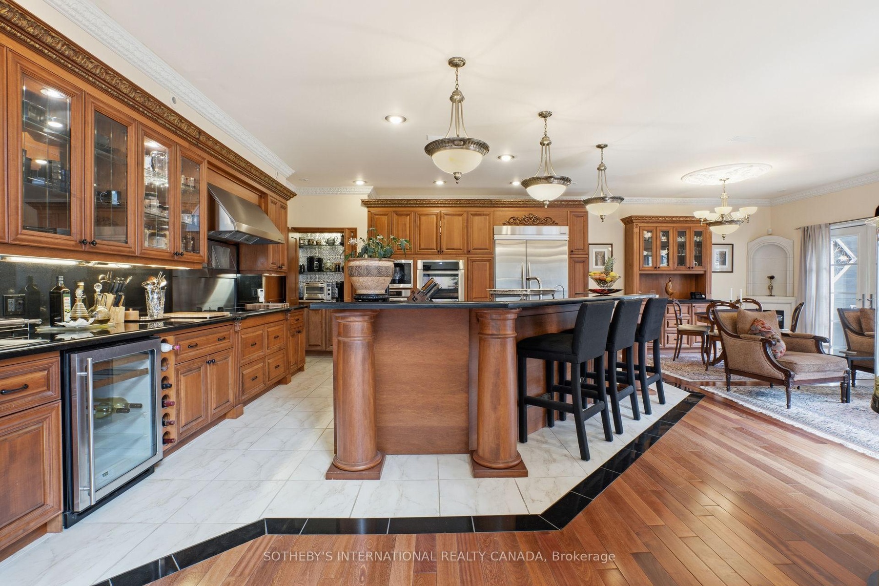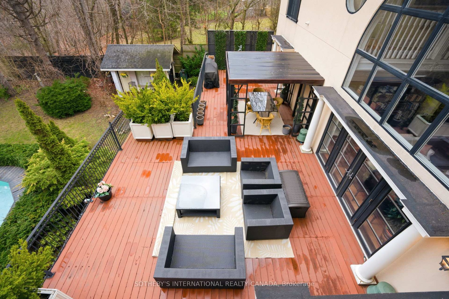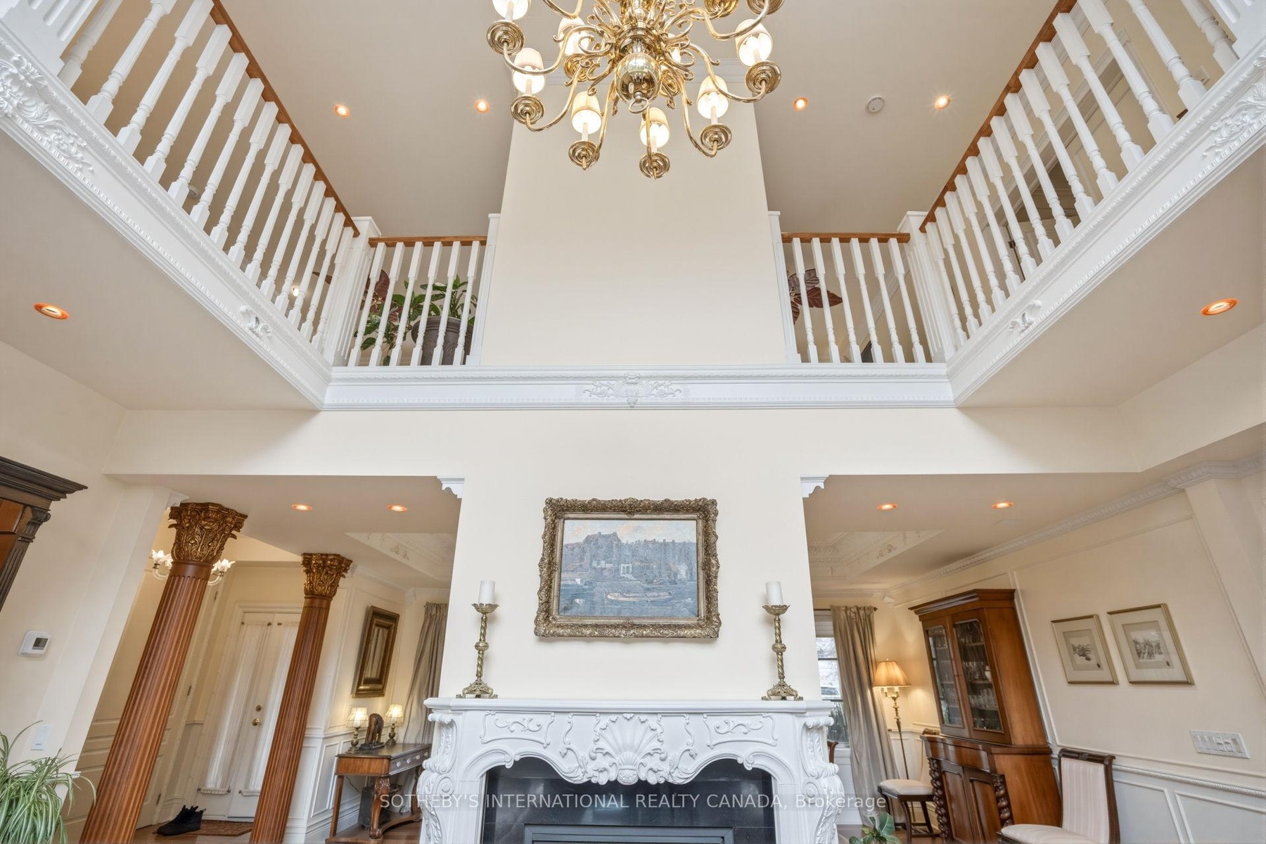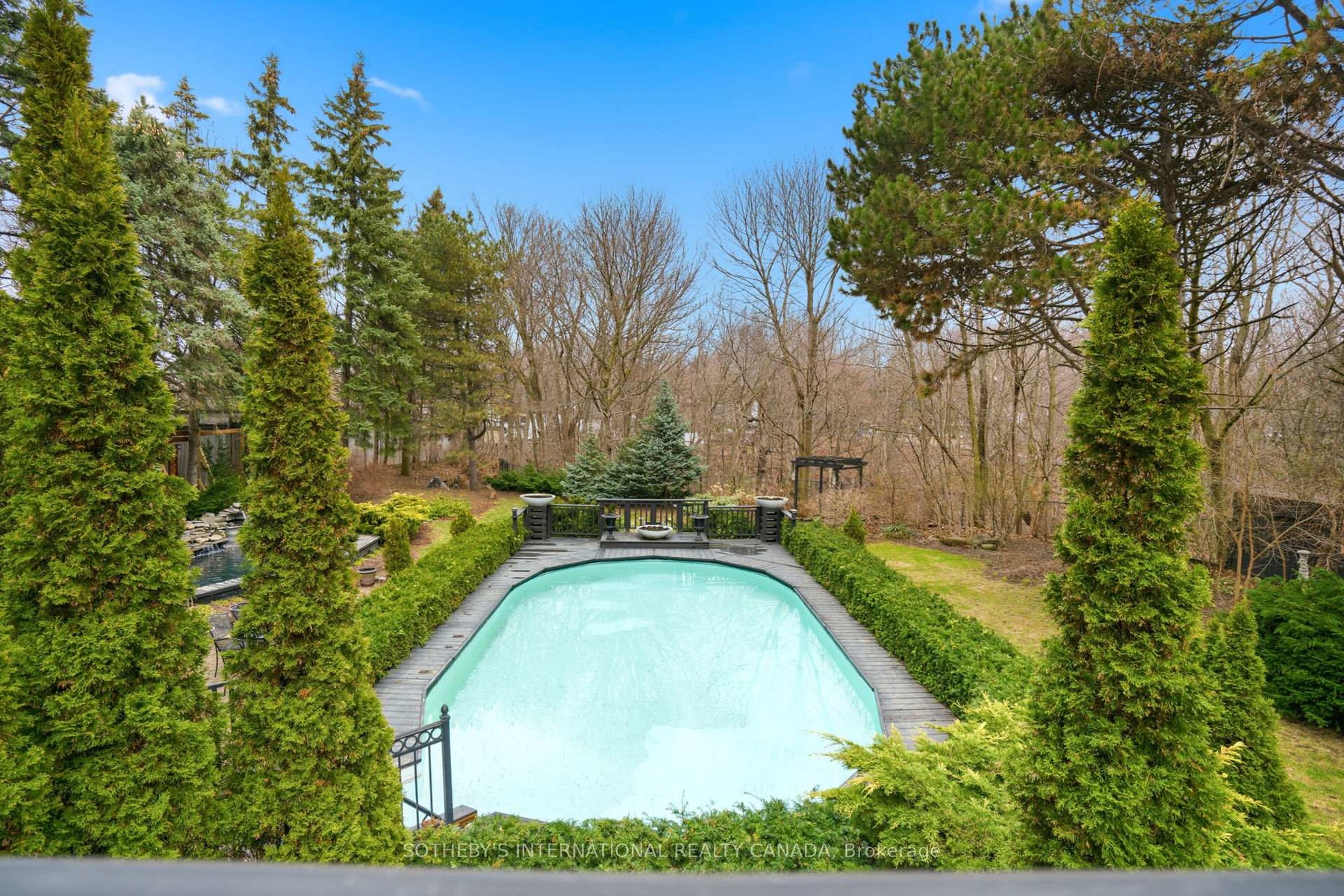 Welcome to 55 Pine Ridge Drive, a custom residence set on a private, tree-lined ravine lot near the Bluffs. Rebuilt approximately 15 years ago on the original 1954 foundation, this bright, generously scaled home offers refined millwork, Brazilian cherry hardwood, porcelain tile, multiple fireplaces, a hydraulic elevator, and a dramatic two-storey great room with a striking Palladian window overlooking the gardens. The custom kitchen was designed with both function and entertaining in mind, featuring dark-stained maple cabinetry, Nero Assoluto granite, a centre island with raised bar and hidden buffet table, two Miele dishwashers, multiple sinks and work areas, side-by-side KitchenAid fridge and freezer, Electrolux wall ovens and microwave, Miele steam oven, induction cooktop, dedicated gas wok burner, and a bright breakfast area with walkout to the deck. The home offers five bedrooms and five full bathrooms across three levels. The upper level includes a private primary retreat with fireplace, balcony, walk-in closets, dressing area, and five-piece ensuite, along with additional suite-like bedroom space and an upper family room. The lower level adds a recreation room, gym, steam room, hot tub, wet bar, guest bedroom, and walkout access. Outside, the landscaped grounds unfold as a private retreat with extensive decking, terraces, pond and waterfall, pool house, and gas-heated saltwater pool. Located on one of the most desirable streets, close to the Bluffs, parks, schools, Kingston Road amenities, Eglinton GO, Scarborough GO, Kennedy Station, and Highway 401.