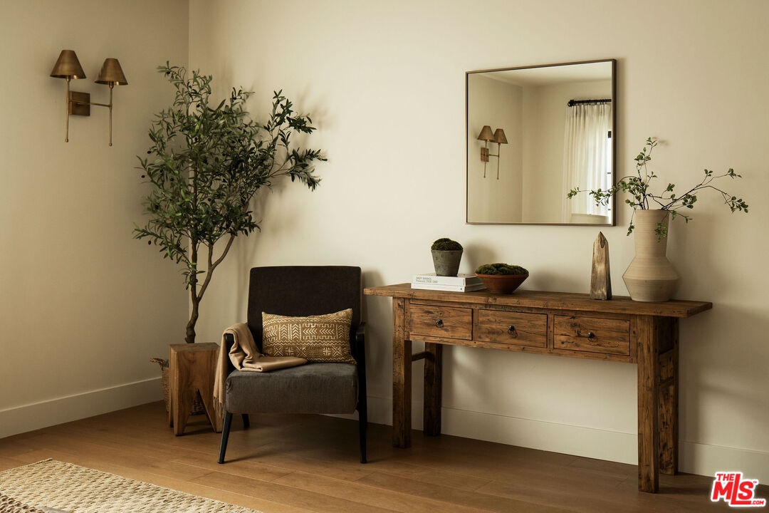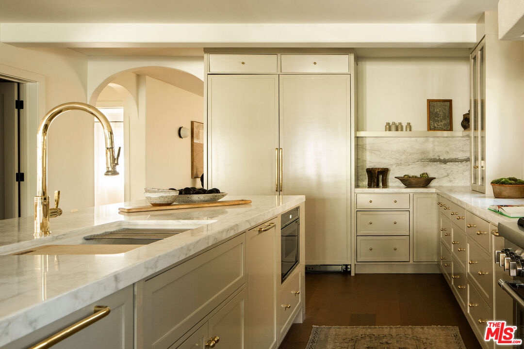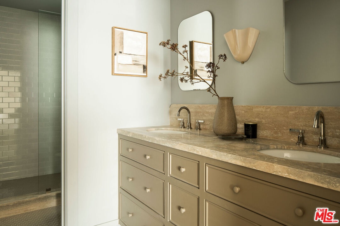 The curb appeal of this newly renovated Spanish home in Sycamore Square sets an exceptional first impressionand the rest of the property more than delivers. Thoughtfully reimagined by Jaime Morse of Morse Design at a level of fine luxury, every detail has been carefully curated. The exterior showcases smooth stucco, refined drought-tolerant landscaping, travertine pavers, and elegant landscape lighting, all anchored by a striking sixty-year-old olive tree evoking the charm of a Mediterranean retreat. Multiple gated entry points provide both privacy and a sense of exclusivity. Inside, an expansive foyer welcomes you with an elegant curved staircase, a stunning powder room finished in lime-washed paint, and a seamless open floor plan that flows through the spacious main level. Hennessy white oak floors run throughout, complemented by custom, hand-selected lighting fixtures sourced from around the world. The nearly 40-foot-long kitchen is a true centerpiece, appointed with Sub-Zero, Thermador, and JennAir appliances. Brass hardware and warm paint tones pair beautifully with Calacatta Caldia marble countertops and backsplash. A dramatic center island, measuring over 13 feet, offers ample space for both food preparation and dining. The kitchen opens to a generous living room, where a fireplace serves as the focal point, and soft afternoon light pours through west-facing French doors and windows. This five-bedroom home features four bedrooms upstairs, each enhanced with custom fixtures and built-in closets. The primary suite is a private retreat, featuring Portola lime-wash paint, a walk-in closet, and a spacious bathroom with Aero Cream marble shower tile. An upstairs family room provides additional space for relaxation or play. The reimagined backyard is designed for both entertaining and tranquility, featuring a heated pool and spa, lush grass, and tall ficus trees for privacy. A well-appointed pool house includes a covered open-air lounge area, along with an enclosed space ideal for a gym or art studio. This exceptional renovation offers a refined living experience that will appeal to the most discerning buyer.The permitted Pool House/Rec Room at 579 square feet is in addition to the square footage of the main house at 4,400 square feet per plans. Includes enclosed and covered space.