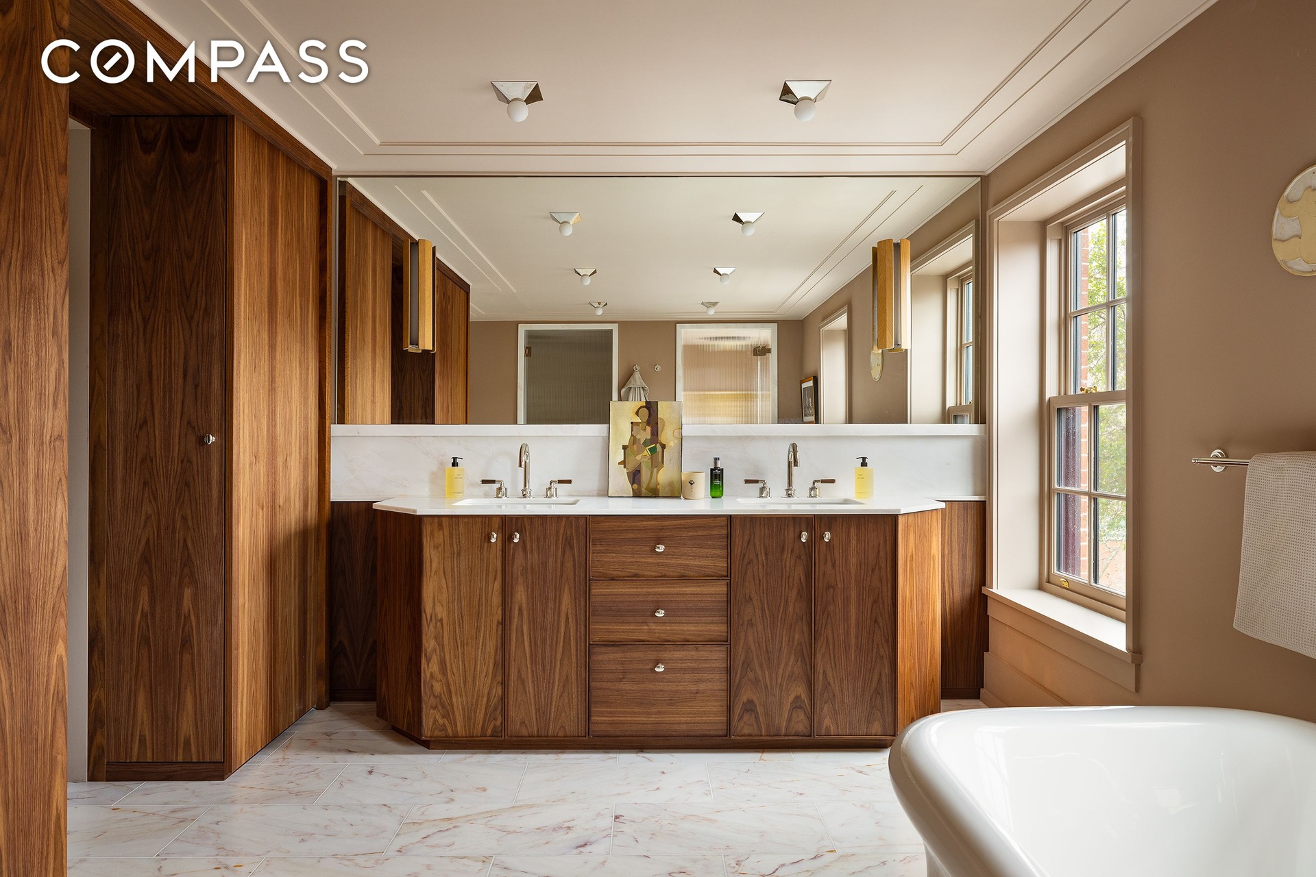 Finishes include Waterworks fixtures, bespoke cabinetry with Blum hardware, and a refined Farrow & Ball palette, complemented by limewashed walls and millwork inspired by 19th-century interiors.
