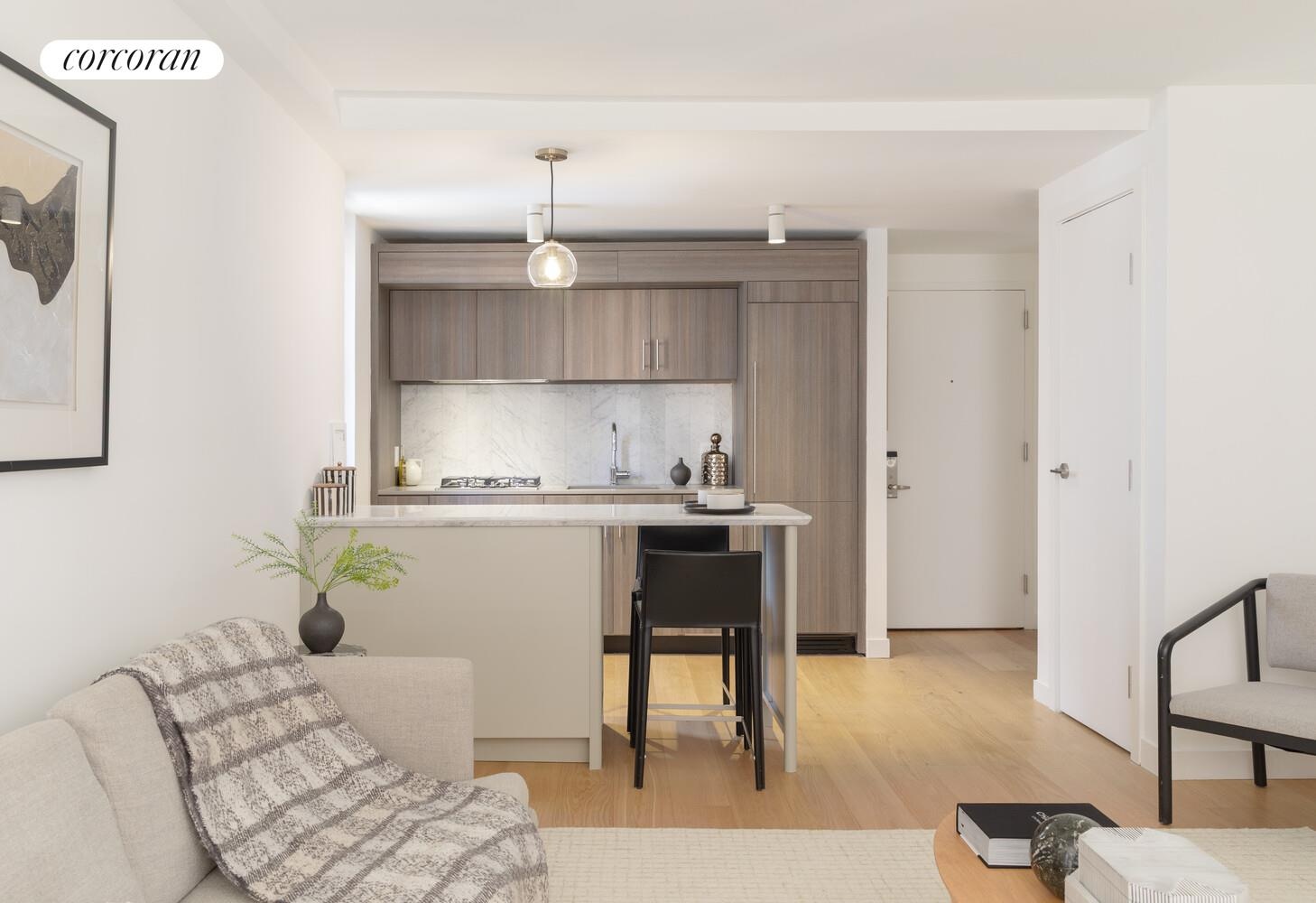Thoughtfully planned, the open kitchen and living room are ideal for entertaining, while the private balcony and offers a private green space above the city.