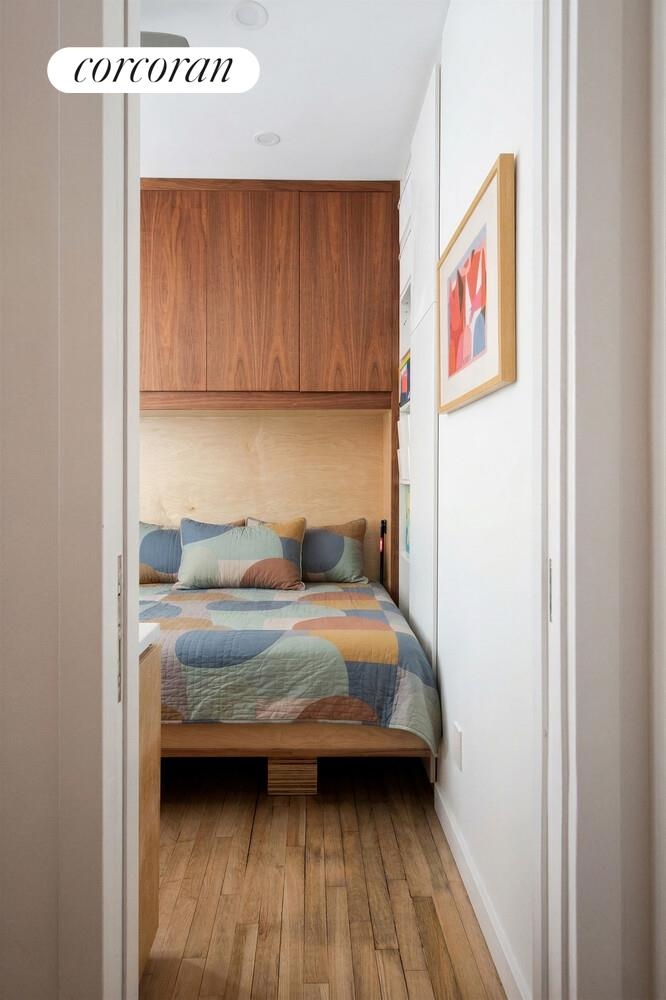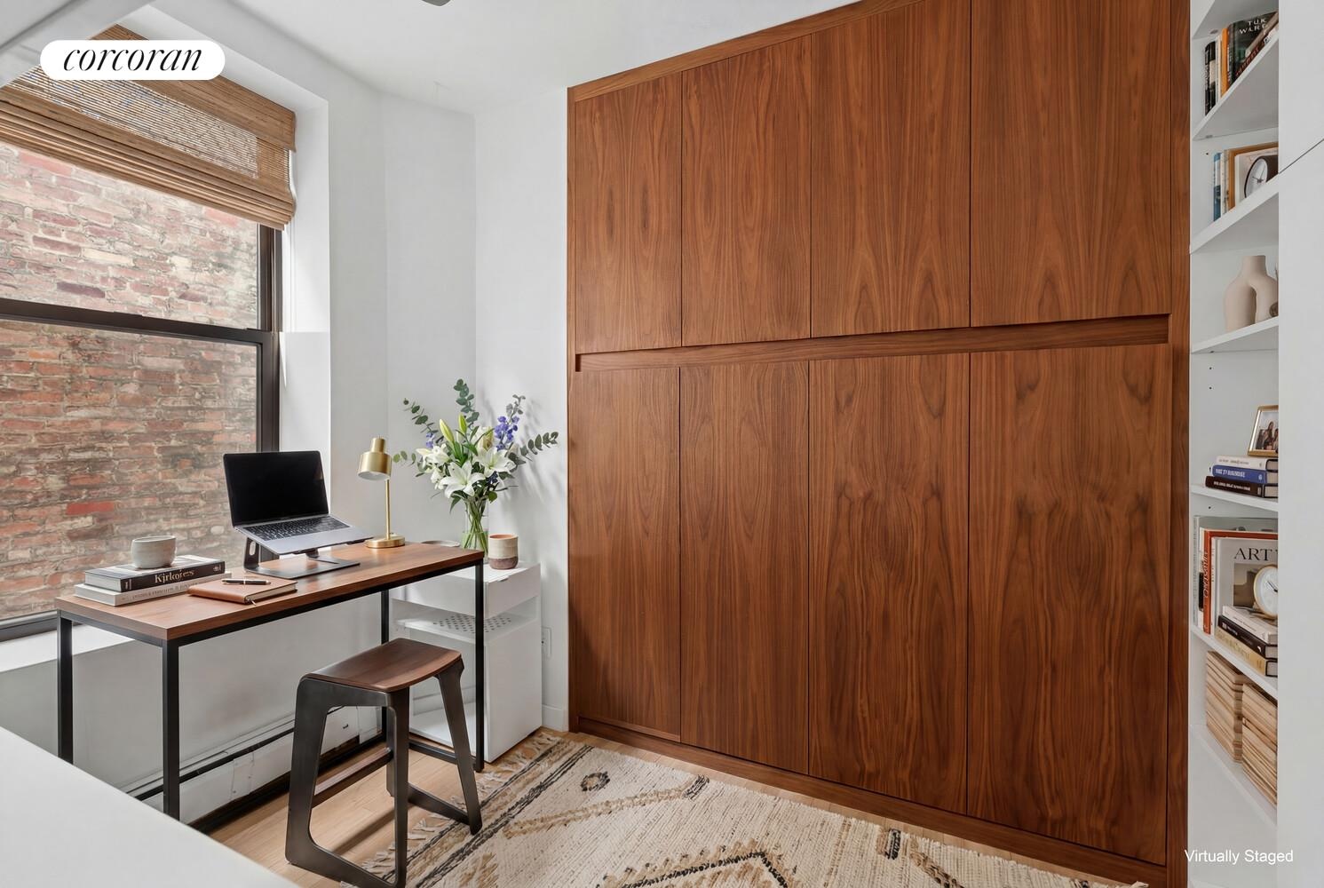 There is elegant custom wood storage throughout the home including a built in Murphy bed in the second bedroom and a desk setup for working from home and refinished white oak pickled floors throughout.