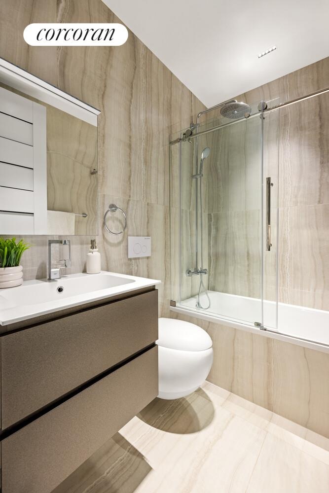 Both bathrooms are finished in sophisticated large-format stone tile with floating vanities and polished fixtures; the main bath includes a glass-enclosed rain shower with a handheld extension and modern wall-mounted toilet.