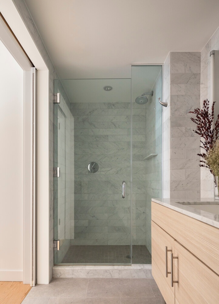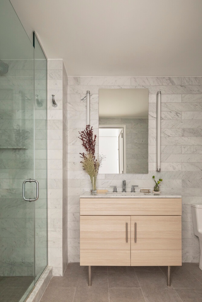 Wide-plank white oak flooring, large-scale windows and glass doors, and a serene marble bath create a calm, cohesive interior palette. With an in-home Bosch washer/dryer, the layout prioritizes real livability.