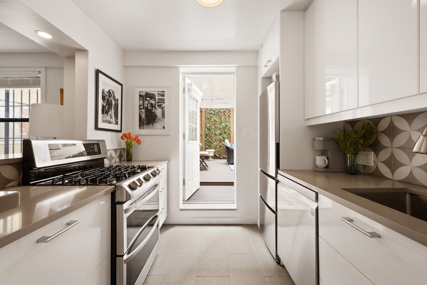 The home was fully renovated in recent years including a windowed bathroom with step-in shower, and custom kitchen finishes with GE appliances. Just off the kitchen, the private deck makes for an urban oasis, ideal for enjoying a morning coffee or entertaining guests with outdoor dining.