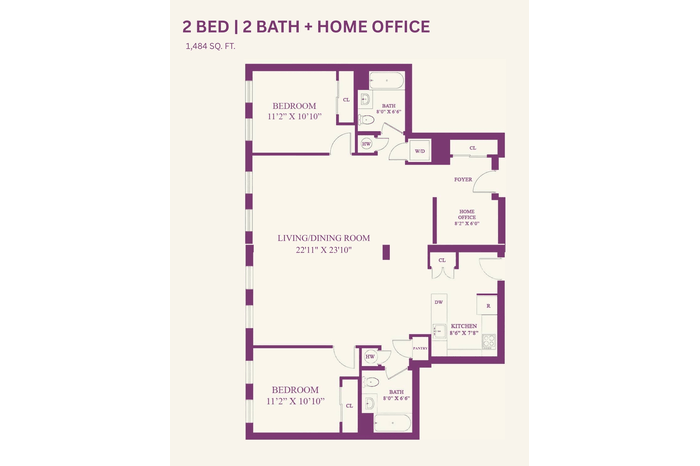 Residence 2F is a front-facing combination unit spanning the full 50-foot width of the building, offering an expansive two-bedroom, two-bathroom layout with a versatile design suited to a variety of living arrangements. Soaring 11-foot ceilings enhance the sense of scale throughout the home.