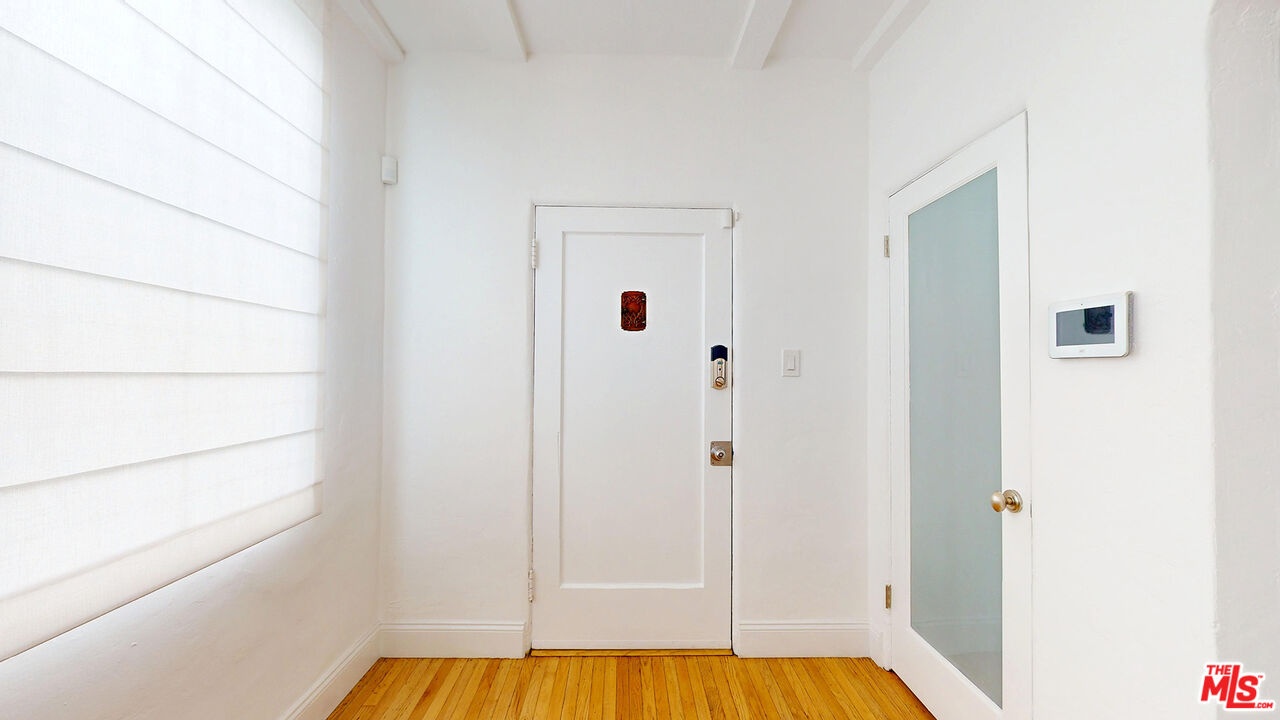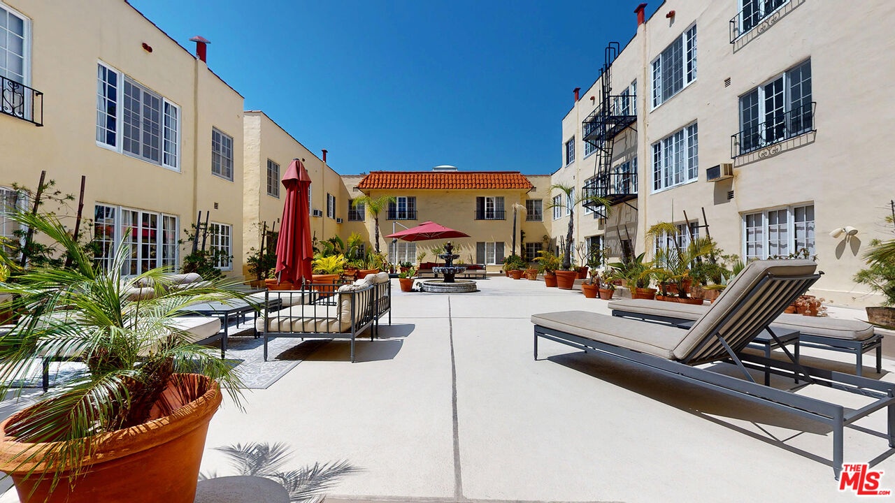 This sunlit top-floor end-unit residence captures the essence of classic LA living in a charming Spanish Hacienda setting. Set within a well-maintained, secure 1929 architectural gem south of Sunset, the building features security cameras and a lush open courtyard that creates a peaceful, resort-like setting.Reimagined in 2020, the residence enjoys only one shared wall, abundant natural light, and serene treetop views. A spacious foyer with a large entry closet welcomes you, while low HOA dues include all utilities. The home blends historic charm with modern refinement, highlighted by central A/C, 2nd bdrm enhanced with a custom-built closet, 9-foot coved ceilings, warm oak floors, & smooth plaster walls. The kitchen has been recently upgraded with a luxury standalone refrigerator partially replacing the original under-counter European built-in alongside Viking appliances, sleek countertops, and a farmhouse sink. A portion of the original built-in fridge remains functioning as a secondary fridge and a charming bonus..The bathroom features Carrera marble complemented by high-end fixtures.. Additional highlights include side-by-side subt. parking with private storage & a central location with easy access to BH, the Westside, and the Valley. Notably, a slightly larger unit (#209, +34 sq ft) sold for $750,000 on 3/17/26 without high-end updates, underscoring the value offered here. Unbeatable location at an exceptional value.