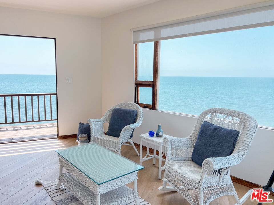 It's the best time of the year to enjoy Malibu! Stunning sunsets, a cool ocean breeze and the sound of waves to fill the soul. Enjoy the best beach life from this charming reimagined Malibu road home. This special property is located on a stretch of sand that affords privacy for the most discerning. House has been updated with new floors throughout, fresh paint, new fireplace, updated bathrooms, Solar, EV capability and much much more. Be delighted with spectacular ocean views from walls of glass in living room that adorn the well appointed sitting and dining area. Perfect for capturing both sunrise and sunset views! The open floor plan flows effortlessly into dining room and outdoor oceanfront entertaining area. Listen to the sound of waves while sipping a glass of wine or enjoying a great book! Its truly an oasis. Kitchen has newer Thermador cooktop and plenty of cabinet space. Spacious primary suite has expansive ocean views, large walk-in closet, sitting area, built-in desk, and updated bathroom. Sunsets are stunning from the private balcony. Two guest bedrooms have been renovated with new furnishings and are filled with warm natural light. Upstairs guest bathroom has also been completely remodeled. Escape with long walks on the beach or paddle board up the pristine coastline. Close to Soho house, Nobu, other fine dining, shopping and hiking trails. Its the perfect escape!