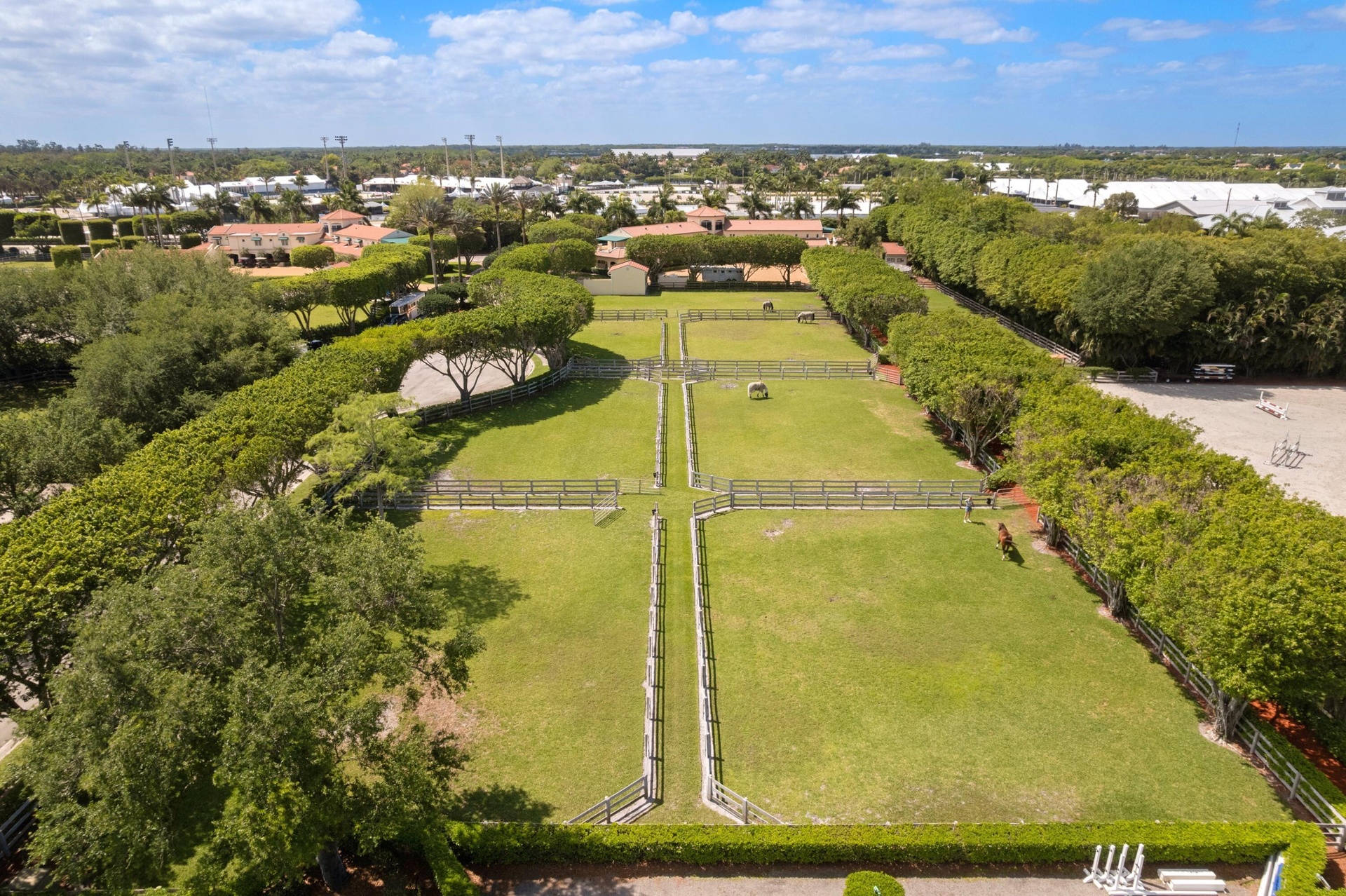 Rare opportunity to own one of the most intriguing equestrian farm locations just steps away from the world-renowned Winter Equestrian Festival in Wellington. Perfectly positioned for riders, trainers, and investors alike, this exceptional property offers both convenience and a fully equipped, income-producing setup on just over 6 acres. Designed with functionality and comfort in mind, the farm features two well-appointed living quarters above the barn. Suite One offers a spacious 3-bedroom, 2.5-bath layout, while Suite Two includes 4 bedrooms and 2 bathrooms, highlighted by a convenient Jack-and-Jill design—ideal for staff, guests, or rental income. The barn is equipped with 16 stalls and 4 wash stalls, complemented by a fly spray system to ensure optimal care and comfort for the horses. The property includes nine well-maintained paddocks, all supported by water cannon irrigation for efficient and consistent coverage. Equestrian amenities are second to none, featuring a professional riding arena along with an oversized grass warm-up/cool-down arena positioned at the front of the property for easy access and presentation. Additional features include a 4-horse circular (walking pen), a large garage-style storage facility, and two additional storage sheds to accommodate all equipment and operational needs. For a unique elevated perspective, the property also offers an upper-level viewing gazebo, perfect for observing training sessions or enjoying the tranquil farm setting. This is a rare blend of location, infrastructure, and versatility—ideal for seasonal use, full-time operations, or investment in one of the most sought-after equestrian destinations in the world.
