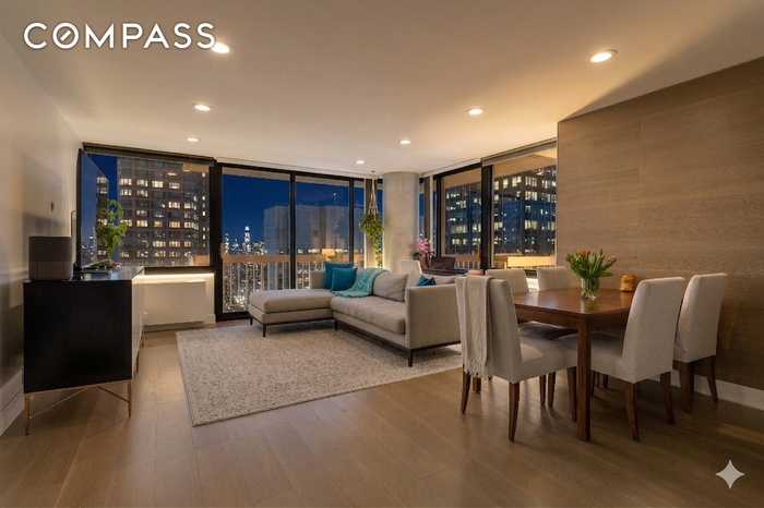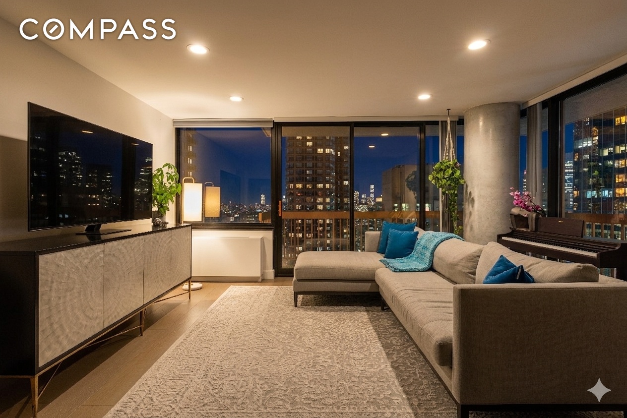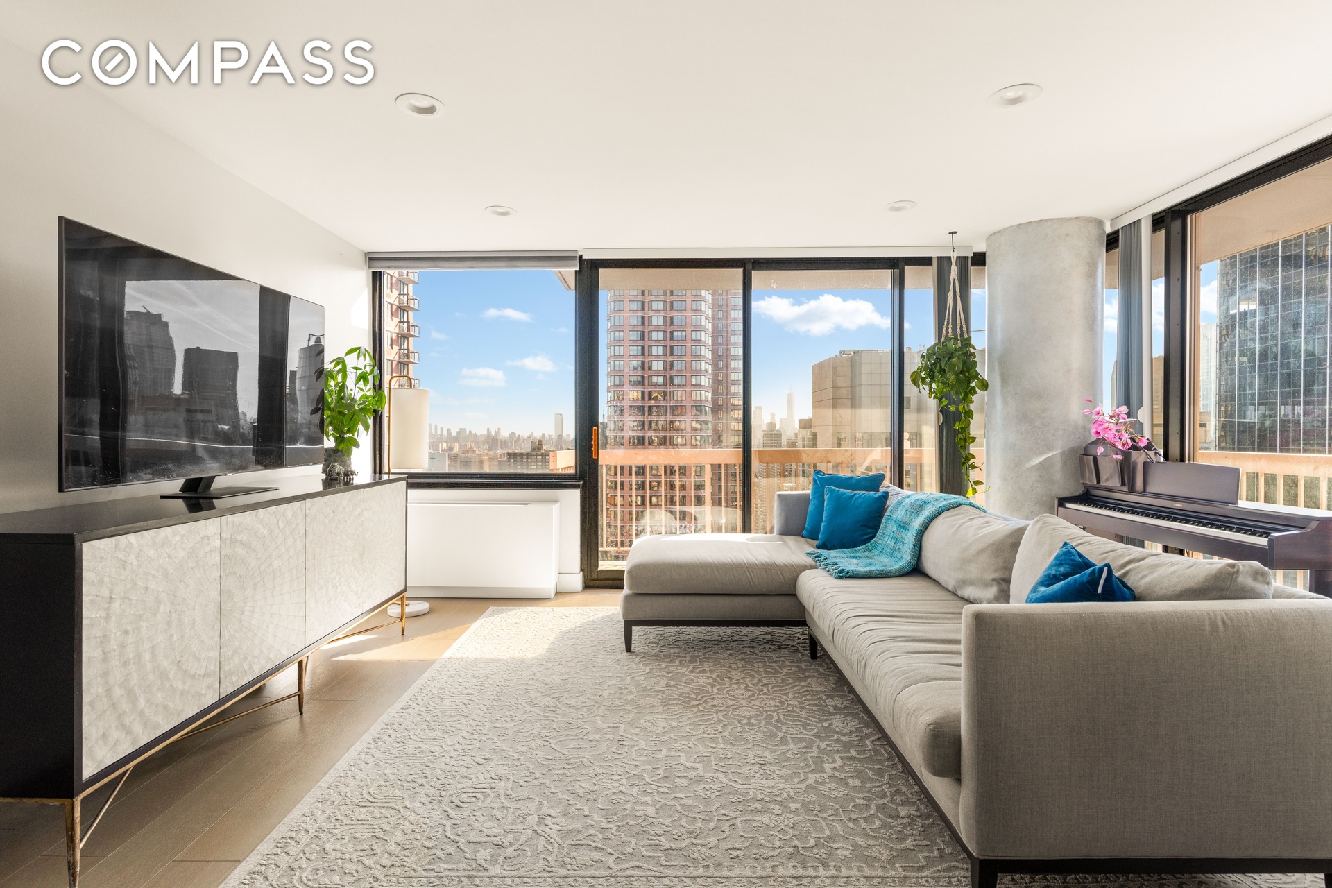 The living area’s open-concept design is framed by iconic corner views, creating a sun-drenched space that flows into a private balcony, featuring elegant wide-plank floors and a custom wood-paneled accent wall.