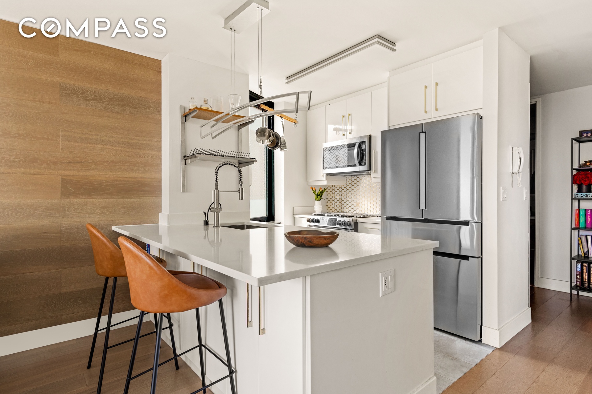 The windowed, open kitchen has been thoughtfully redesigned with a generous breakfast bar, premium appliances, and custom cabinetry to optimize storage.