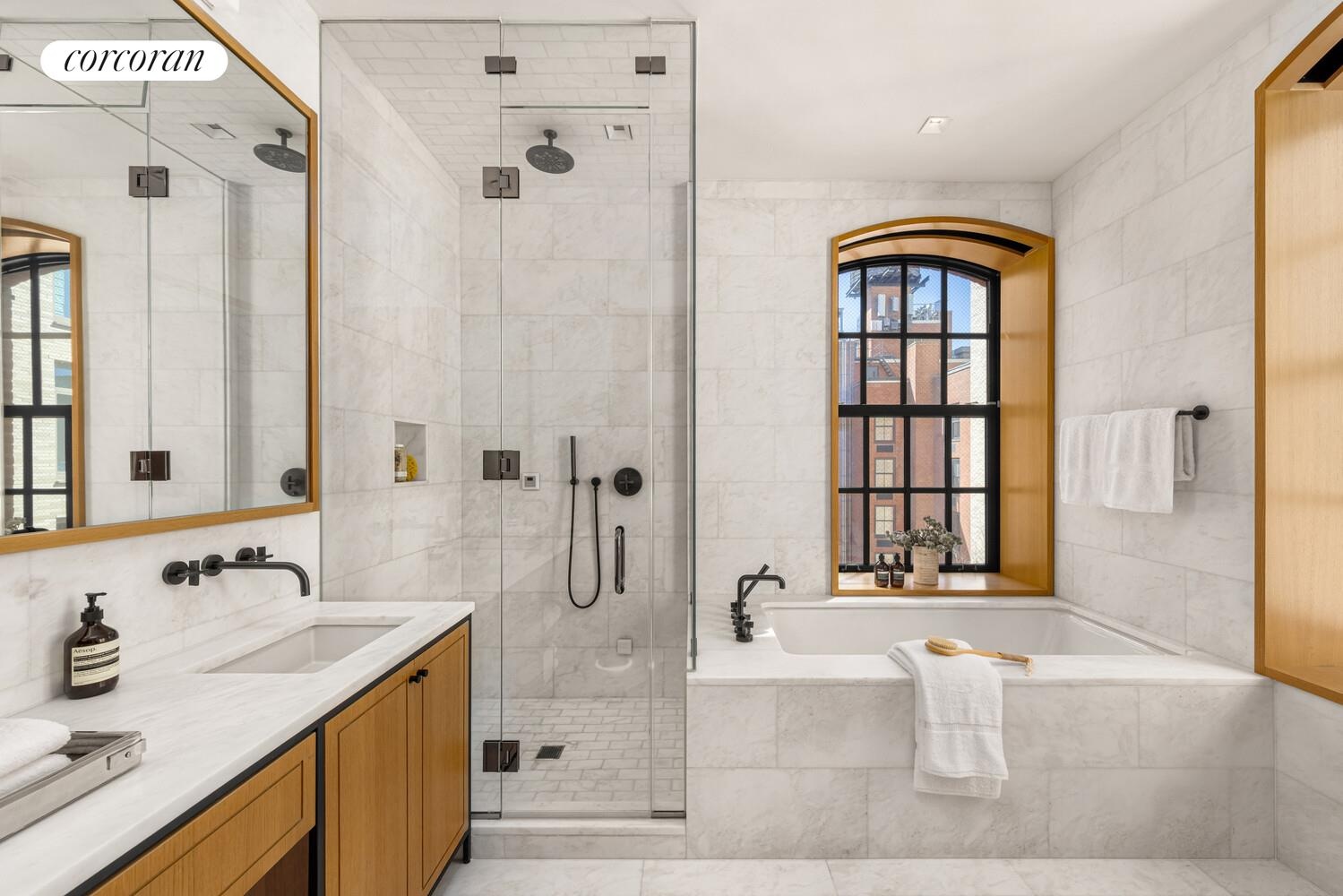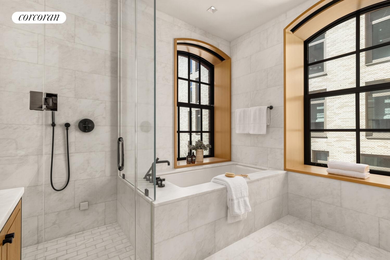 The home offers abundant art walls throughout the living areas, grand foyer, and gallery. The spacious primary features soaring vaulted ceilings and large windows overlooking a beautifully landscaped courtyard garden by renowned designer Ken Smith as well as a large walk-in closet. The luxurious en-suite Calacatta corner primary bathroom is bathed in natural light with both western and southern exposures and includes heated floors, soaking tub, double vanity, and a glass-enclosed steam shower.