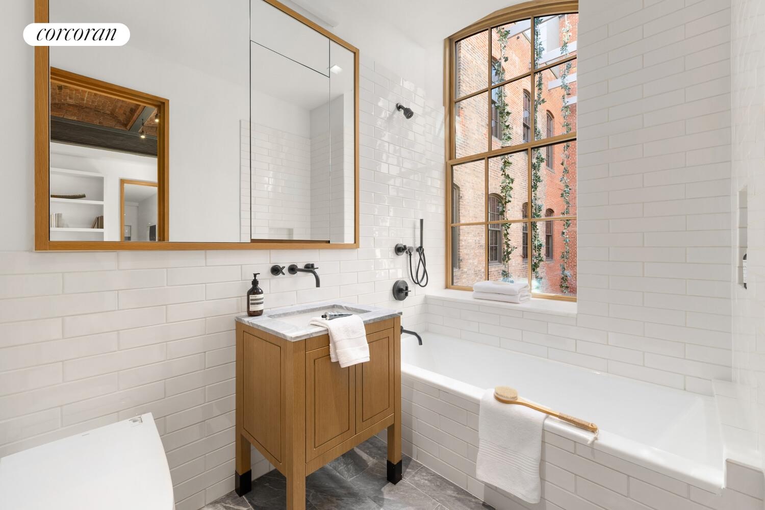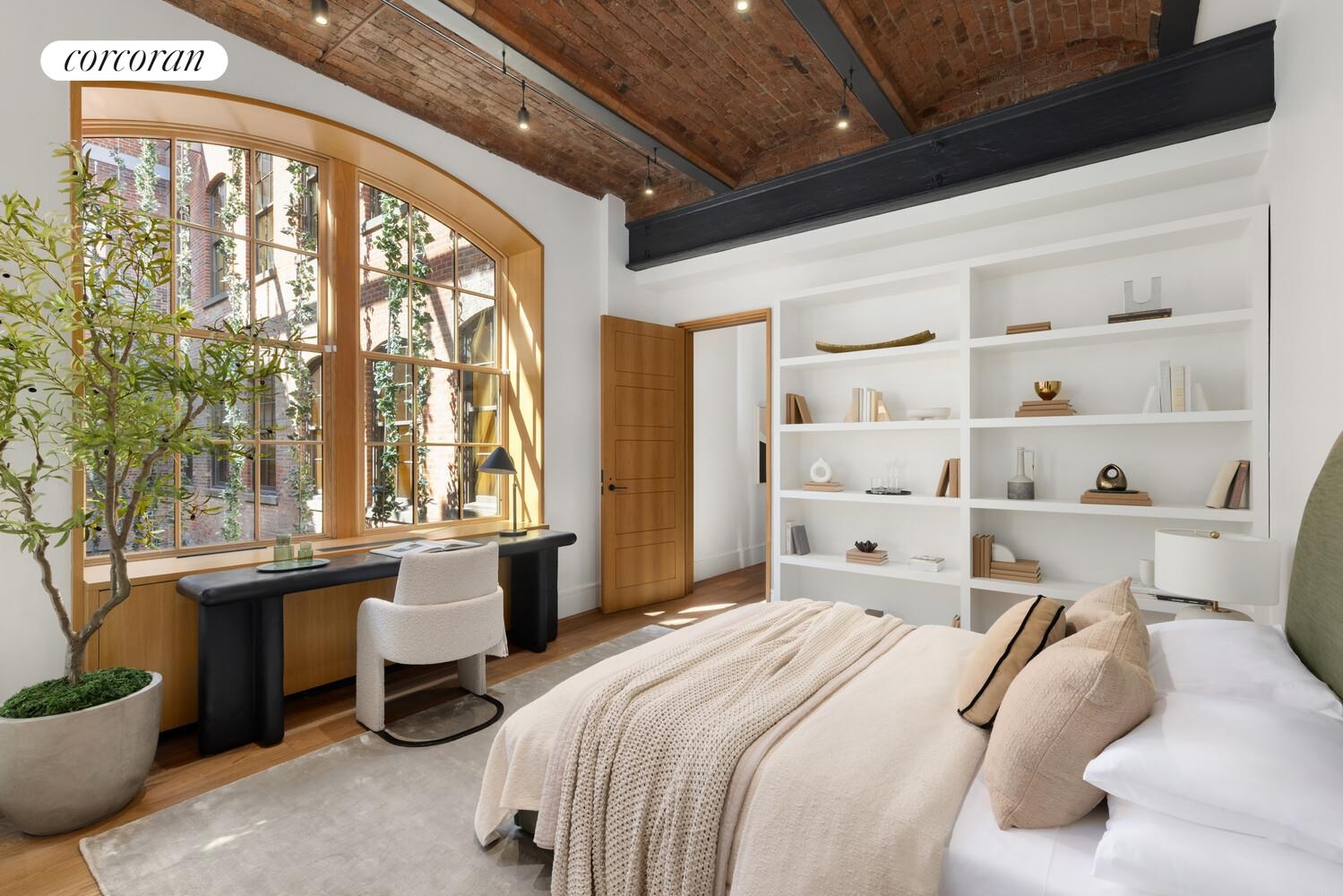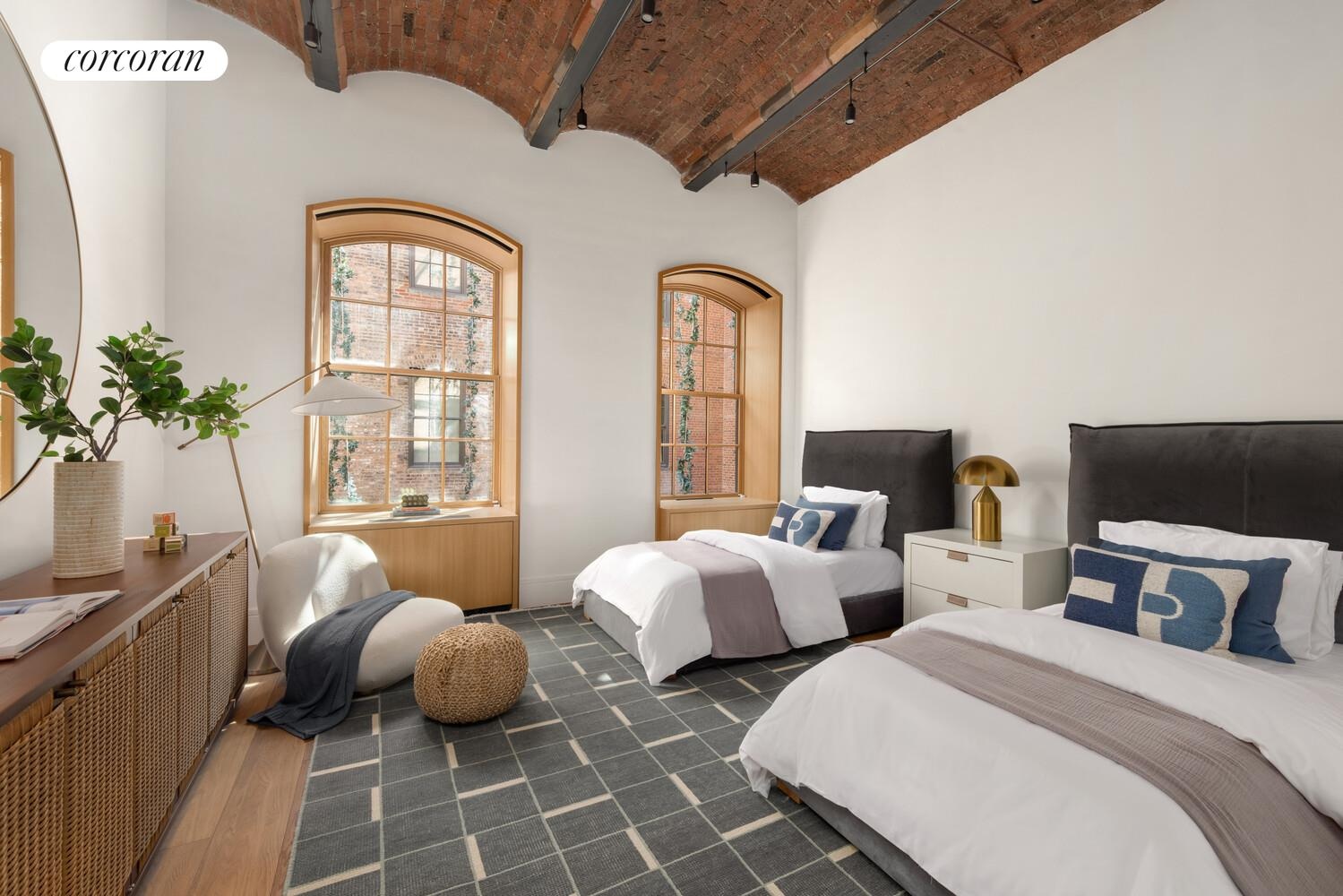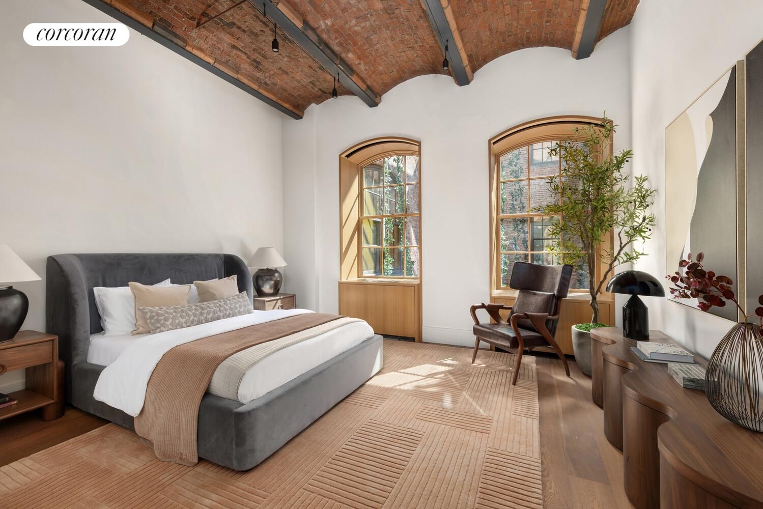 This four bedroom, four and one-half bath residence offers extraordinary proportions and refined craftsmanship throughout. Dramatic 12-foot exposed brick barrel-vaulted ceilings set the tone, complemented by oversized arched wood-framed windows, 7.5-inch wide-plank fumed white oak floors, and custom cold-rolled blackened steel accents.