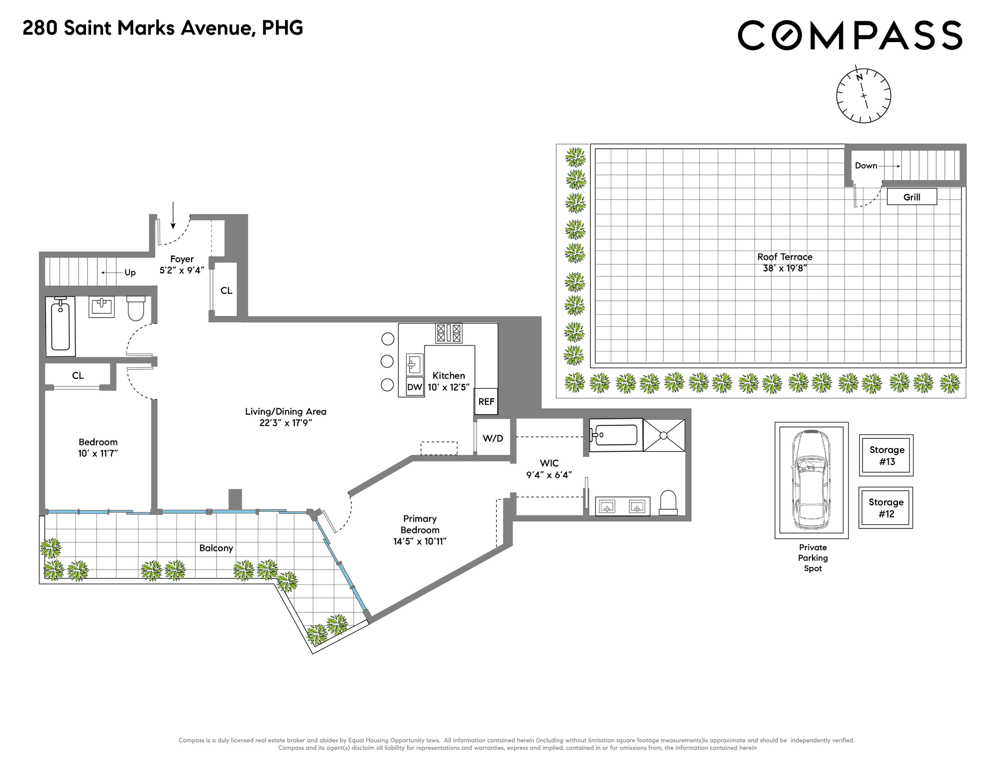 Penthouse G at 280 Saint Marks Avenue offers a rare combination of scale, design, and private outdoor living within a full-service boutique condominium in the heart of Prospect Heights. This split layout two-bedroom, two-bath residence spans 1,321 square feet of interior space and nearly 1,000 square feet of private outdoor area across two levels, including a wraparound balcony and an upper rooftop terrace. The home also includes a deeded private parking space and two large deeded storage units—a truly uncommon combination, as penthouse-level two-bedrooms with expansive outdoor space and private parking are rarely available in today’s market.