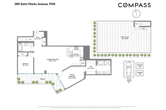 Penthouse G at 280 Saint Marks Avenue offers a rare combination of scale, design, and private outdoor living within a full-service boutique condominium in the heart of Prospect Heights. This split layout two-bedroom, two-bath residence spans 1,321 square feet of interior space and nearly 1,000 square feet of private outdoor area across two levels, including a wraparound balcony and an upper rooftop terrace. The home also includes a deeded private parking space and two large deeded storage units—a truly uncommon combination, as penthouse-level two-bedrooms with expansive outdoor space and private parking are rarely available in today’s market.
