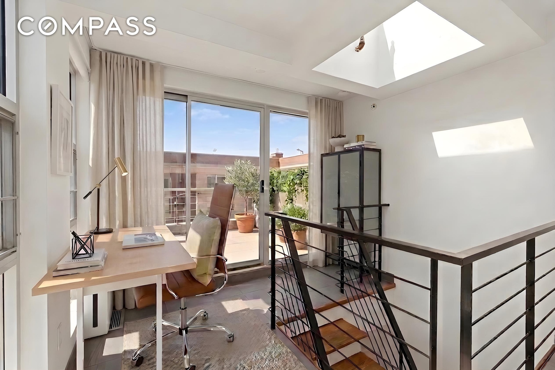 The main floor greets you with sunlit, south-facing living and dining areas that seamlessly flow toward a beautifully landscaped private terrace spanning nearly 200 square feet. Perfect for relaxing with a book, hosting friends, or savoring al fresco meals under the city sky, this outdoor oasis is a true gem. The sleek, modern kitchen will delight any chef, while a flexible den—currently styled as a dining room but equally suited as a home office or guest space—adds versatility to the layout. A full, windowed bathroom completes this level.