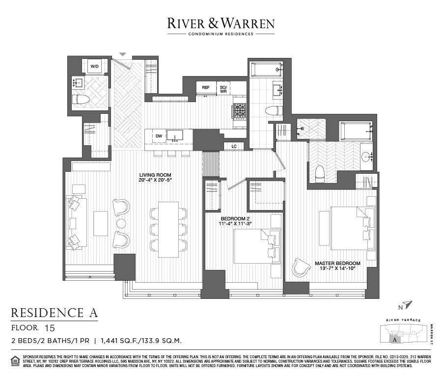 Welcome home to residence 15A at River and Warren. This sun filled 1,441 sq. ft. apartment features 2 bedrooms / 2.5 bathrooms. The residence encompasses eastern exposure for cityscape Manhattan views overlooking pristine Teardrop Park. The modern unit features Crestron home automation for shades, lights, and integrated entertainment as well as Nest thermostats throughout. 15A has a gracious layout and is the epitome of luxury living.