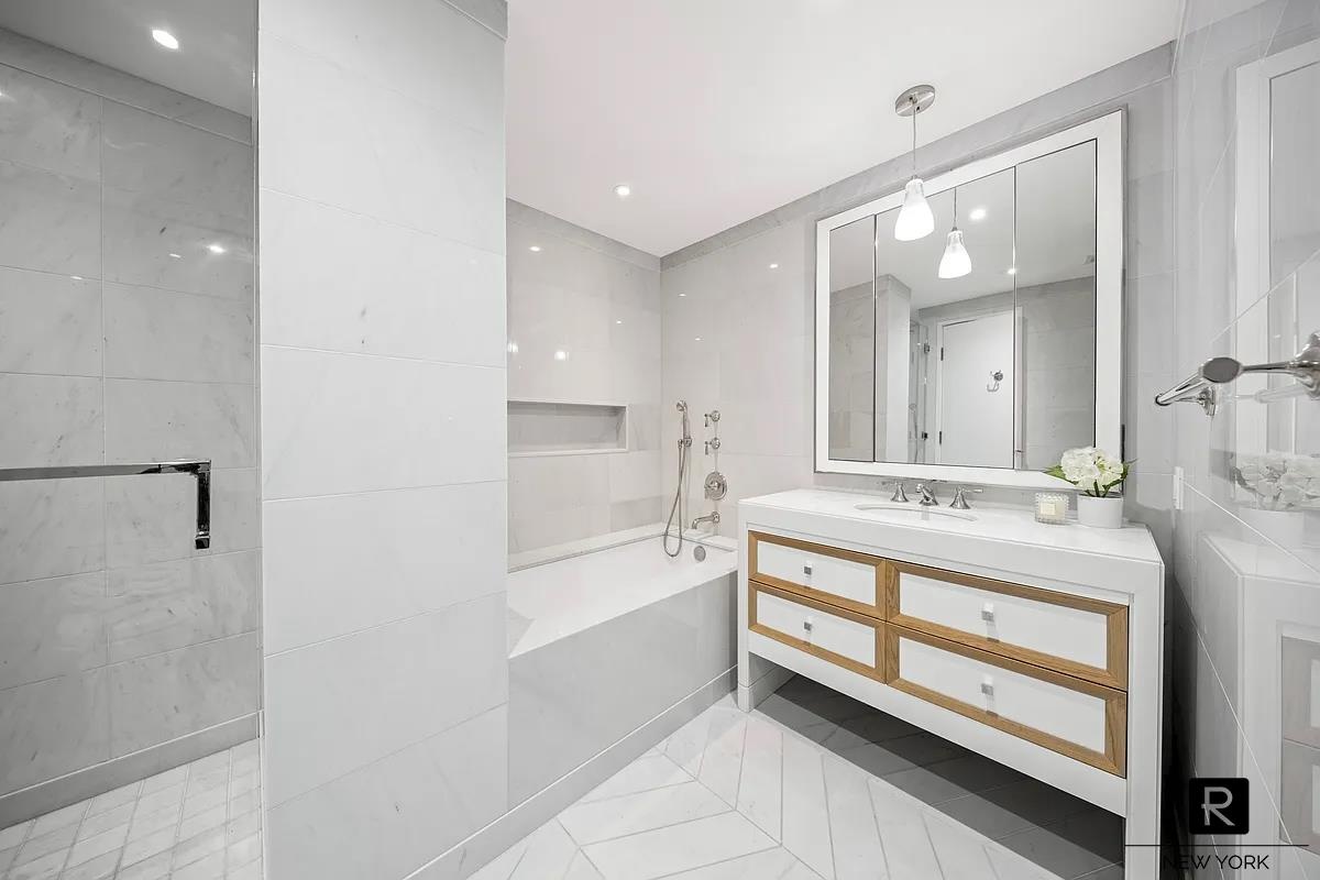 The king-sized master bedroom is flooded with natural morning light and boasts three generously sized closets, as well as automated black-out shades. The en-suite master bathroom is appointed with Bianco Puro marble walls and chevron patterned floors, as well as a custom-designed white oak vanity with polished nickel detail and Bianco Sivic marble top, Waterworks fixtures, oversized standing shower, and a deep-soaking tub.