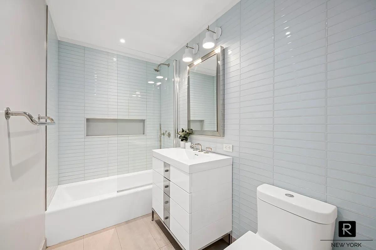 The second bedroom is perfectly sized for a Nursery, Home Office or proper guest room. The room is also equipped with automated black-out shades. The second bathroom is beautifully appointed with high-end fixtures, blue glass tiles, and a shower/tub combination.