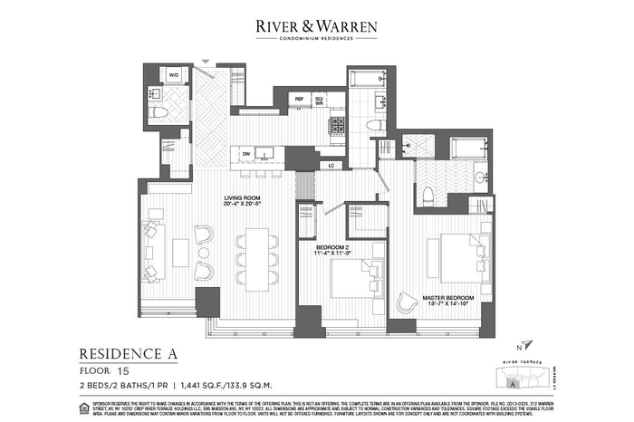 Welcome home to residence 15A at River and Warren. This sun filled 1,441 sq. ft. apartment features 2 bedrooms / 2.5 bathrooms. The residence encompasses eastern exposure for cityscape Manhattan views overlooking pristine Teardrop Park. The modern unit features Crestron home automation for shades, lights, and integrated entertainment as well as Nest thermostats throughout. 15A has a gracious layout and is the epitome of luxury living.