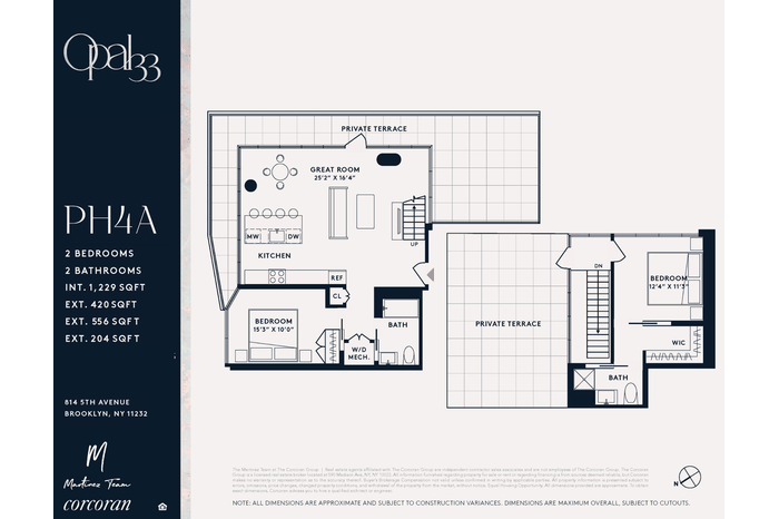 Welcome to Residence 4A at Opal 33, the building's premier duplex penthouse and an extraordinary offering in Greenwood Heights. Spanning 1,209 square feet of impeccably finished interior space across two levels, this two-bedroom, two-bathroom residence is paired with a remarkable 1,180 square feet of private outdoor terraces-creating an unparalleled indoor-outdoor lifestyle. The main level features a grand open-concept great room and kitchen with soaring ceilings, Bertazzoni appliances, and handcrafted millwork, all bathed in natural light from floor-to-ceiling windows. A spacious bedroom and full bath complete the lower level. Ascend the internal staircase to discover a private upper suite with a second bedroom, walk-in closet, and full bath-opening onto an expansive wraparound terrace with sweeping Brooklyn views. Whether you're hosting under the open sky or unwinding in your own urban oasis, Residence 4A offers a scale of indoor-outdoor penthouse living that is truly rare in this market. An in-unit washer/dryer, white oak hardwood floors, and recessed lighting round out this one-of-a-kind home.