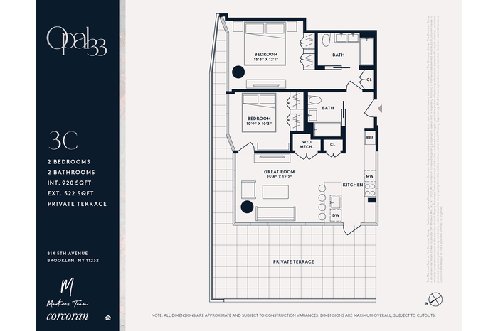 Welcome to Residence 3C at Opal 33, a stunning two-bedroom, two-bathroom home in the heart of Greenwood Heights. At 952 square feet, this thoughtfully designed residence features a generous great room with an open kitchen equipped with Bertazzoni appliances, handcrafted millwork, and sleek modern finishes throughout. Two well-proportioned bedrooms-including a primary suite measuring over 15 feet wide with its own full bath-offer comfortable, private retreats. White oak hardwood floors, floor-to-ceiling windows, and recessed lighting fill the space with warmth and natural light. Step outside to your extraordinary 522-square-foot private terrace-one of the largest in the building-perfect for alfresco dining, lounging, or entertaining against the Brooklyn skyline. With an in-unit washer/dryer and ample closet space, Residence 3C delivers the rare combination of generous indoor living and exceptional outdoor space.