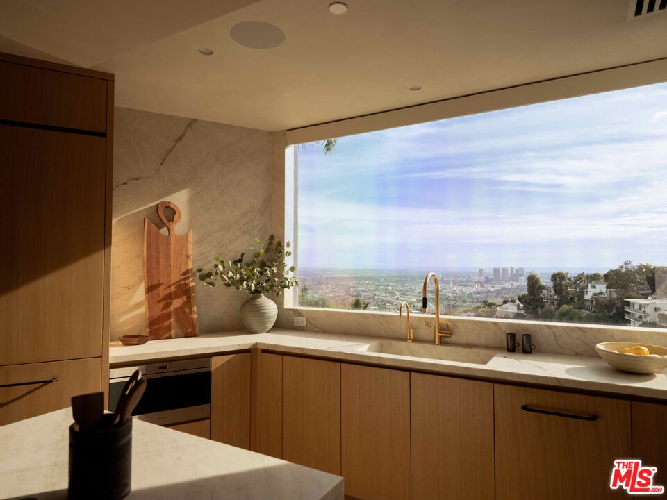 Perched above the Sunset Strip within one of the area's only gated and secure enclaves, 1778 Viewmont stands as the crown jewel of this private, controlled-access community. Positioned at the end of a quiet cul-de-sac, this approximately 6,300-square-foot modern masterpiece is the largest of only six residences behind the gates, offering a rare level of discretion and security alongside unobstructed jetliner views stretching from the city skyline to the Pacific Ocean. Recently reimagined from the ground up, the residence showcases a refined contemporary aesthetic defined by clean lines, warm textures, and sophisticated materials. Inside, expansive open living spaces are framed by floor-to-ceiling glass, flooding the home with natural light while maintaining a true sense of seclusion an ideal retreat from the city below. White oak floors run throughout, complemented by smooth plaster walls, custom millwork, and designer accent lighting that creates a gallery-like ambiance day and night. The chef's kitchen is anchored by travertine stone countertops, integrated Wolf and Sub-Zero appliances, and sleek European cabinetry perfectly suited for both everyday living and large-scale entertaining. Seamless indoor-outdoor living connects the main living areas to an expansive terrace featuring a zero-edge pool and spa, lush landscaping, built-in grill, and grassy yard, all oriented toward the panoramic skyline while remaining thoughtfully shielded within this gated setting. Four ensuite bedrooms, including a serene primary suite with fireplace, oversized walk-in closet, and spa-like bath, provide exceptional comfort and privacy. Additional amenities include a state-of-the-art home theater, world-class gym, and spacious den and bar area that open directly to the pool.Offering a rare combination of privacy, security, and exceptional design, 1778 Viewmont Dr is tailored for those who value discretion without compromise. Securely tucked behind gates, yet just moments from the world-class dining, shopping, and entertainment of the Sunset Strip and Beverly Hills.