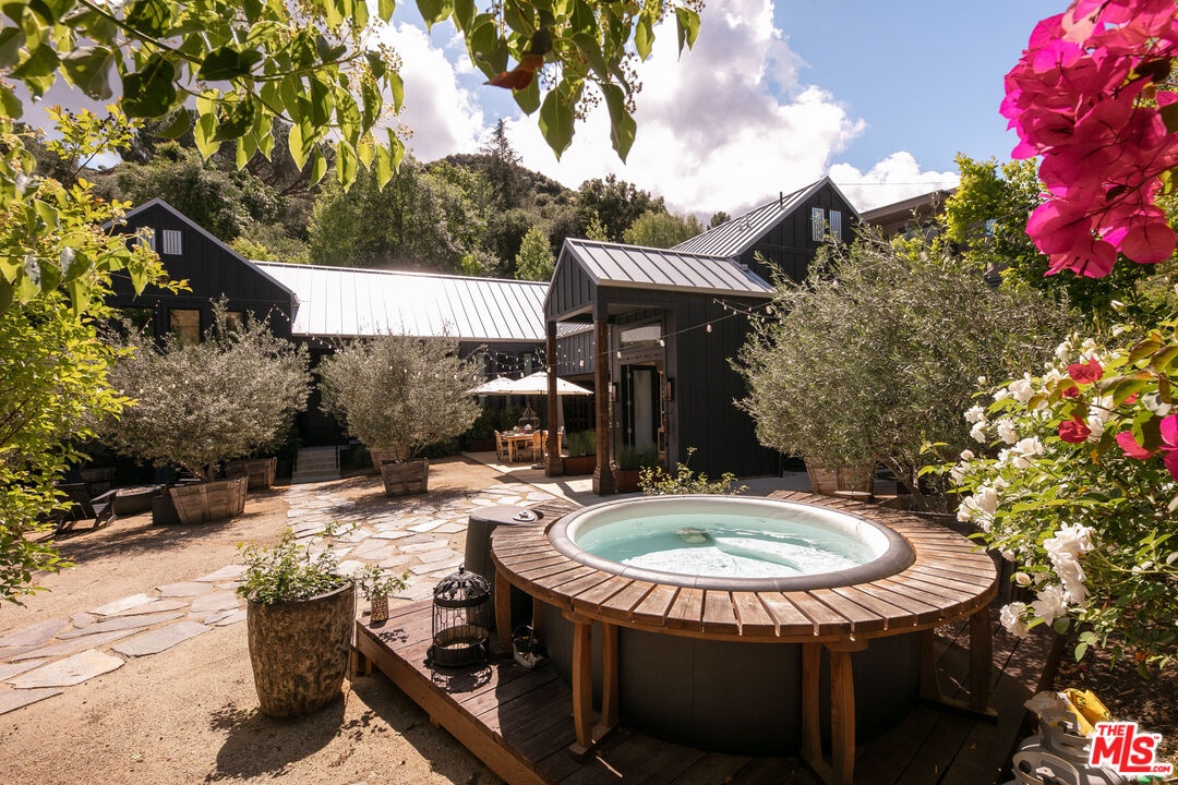 Set on a quiet, tree-lined street in the Malibou Lake community, just moments from the trailhead at Malibu Creek State Park, this 2022-built home feels like a private retreat - equal parts peaceful escape and creative sanctuary. There's an immediate sense of calm here. Mornings begin with soft canyon light filtering through the trees, afternoons drift into walks to the park, and evenings unfold beneath sparkling string lights, gathered around al fresco dining. Nestled in the foothills of the Santa Monica Mountains, the setting is idyllic - lush, grounded, and deeply connected to nature, yet only minutes from Malibu, Calabasas, Cornell, and the heart of Agoura. Inside, the home blends thoughtful modern design with warm, rustic character. Real hardwood floors run throughout, complemented by soaring cathedral ceilings and 25-foot accordion doors that open to outdoor spaces while framing serene mountain views. The heart of the home is the gourmet kitchen with a generous center island, bar seating, and Viking appliances. Natural light fills each room, highlighting the textures and tones that give the home its quiet charm. Designed in a barn-style aesthetic, the layout balances connection with moments of retreat, with multiple outdoor lounge areas and a jacuzzi tucked into the landscape for a quiet unwind. The grounds feel curated yet organic, with olive trees, roses, and fruit trees creating a setting that invites you to slow down and meander. Outfitted with Sonos speakers throughout and wired with Cat 6, the home is equally suited for relaxed living and elevated entertaining. A professional music studio reflects the home's creative spirit, offering flexible use as a studio, bedroom, office, or additional living space. A durable metal roof and extensive fire-wise construction paired with a fire-conscious community design offers a rare level of resilience and long-term cost efficiencies, while a two-car garage offers space for storage or a workshop. Set against rolling hills and surrounded by nature, this home invites you to slow down, create, entertain, and live with intention. A true Malibou Lakeside retreat - peaceful, inspiring, and ready for its next chapter.