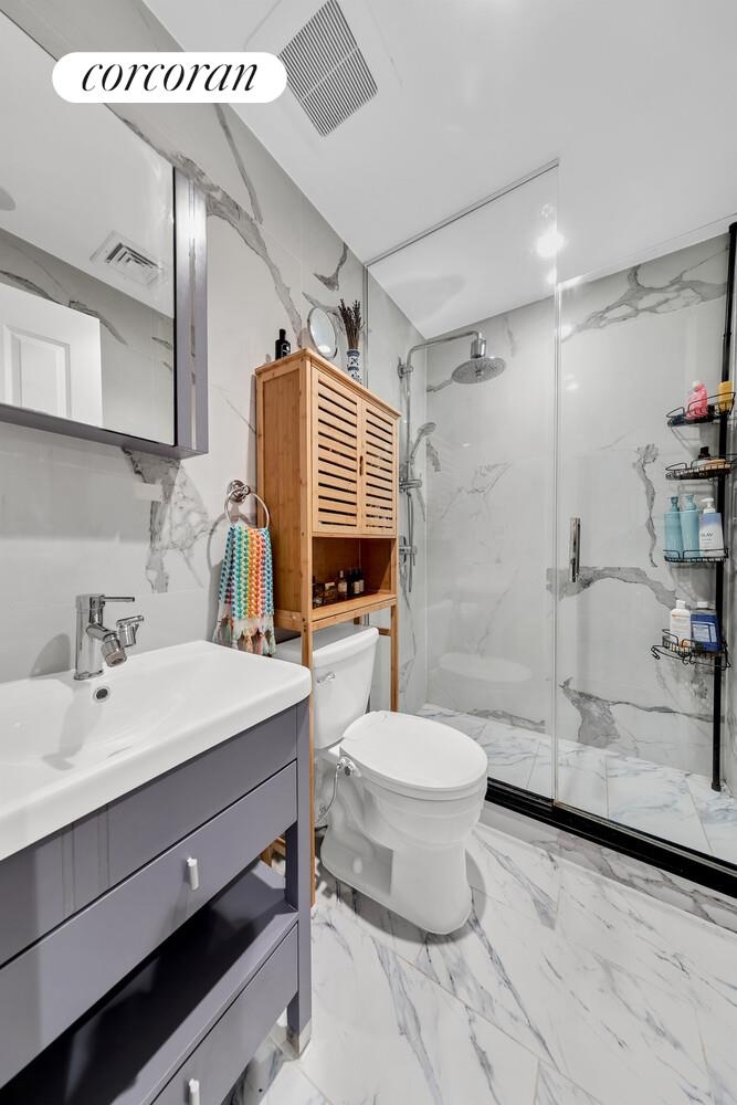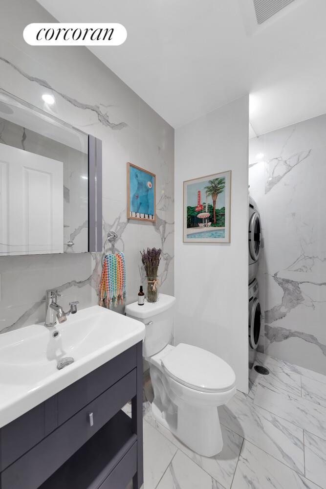 Upstairs, two generously sized bedrooms offer privacy and comfort, each with custom built-out closets providing exceptional storage. The entire apartment is outfitted with ceiling Sonos speakers. The spa-like full bathroom features heated floors for an added touch of luxury.