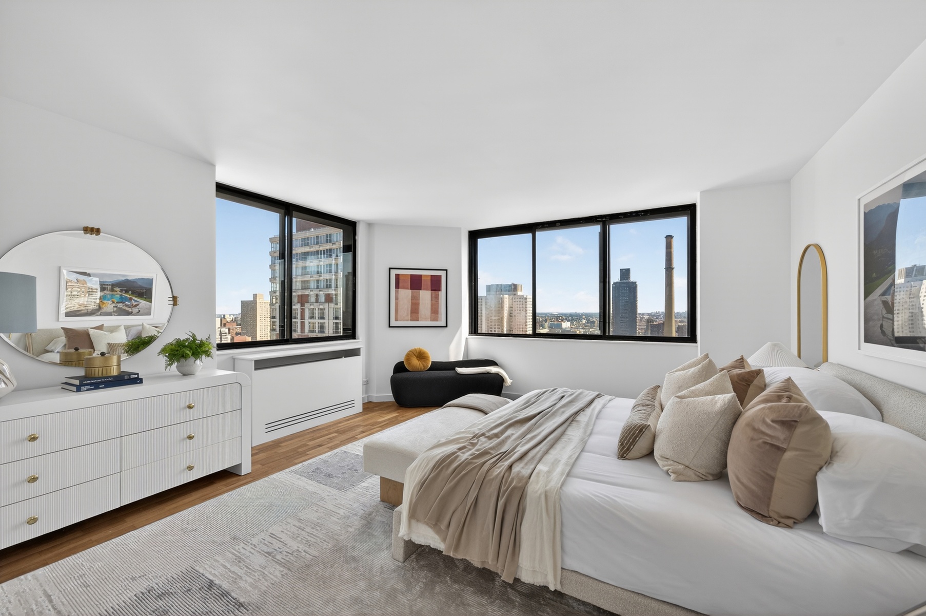 This sky-high home boasts a 27 foot-long, Corner Living Room that gives you plenty of space to entertain and relax. It's massive South and East facing Windows Span End-to-End, giving you Open Views from Midtown to the East River and envelop the room with light. Sliding glass doors open onto a large Balcony, the perfect place for a coffee, a lunch or a meditation session.