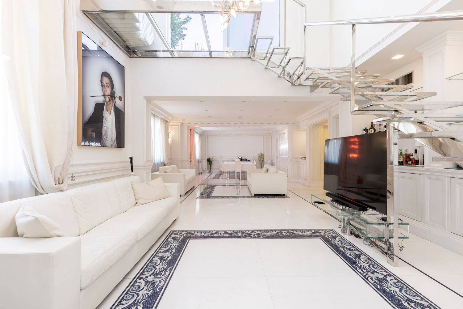The main entrance opens into an impressive reception hall, enhanced by fine marble flooring and a striking helical staircase in steel and glass, which serves as a distinctive architectural centerpiece. The property benefits from three independent entrances and is served by a designer elevator with mirrored finishes, further enhancing the sense of light and sophistication. Externally, two vehicular access points lead to a large marble-paved courtyard with ample parking for cars and motorcycles.