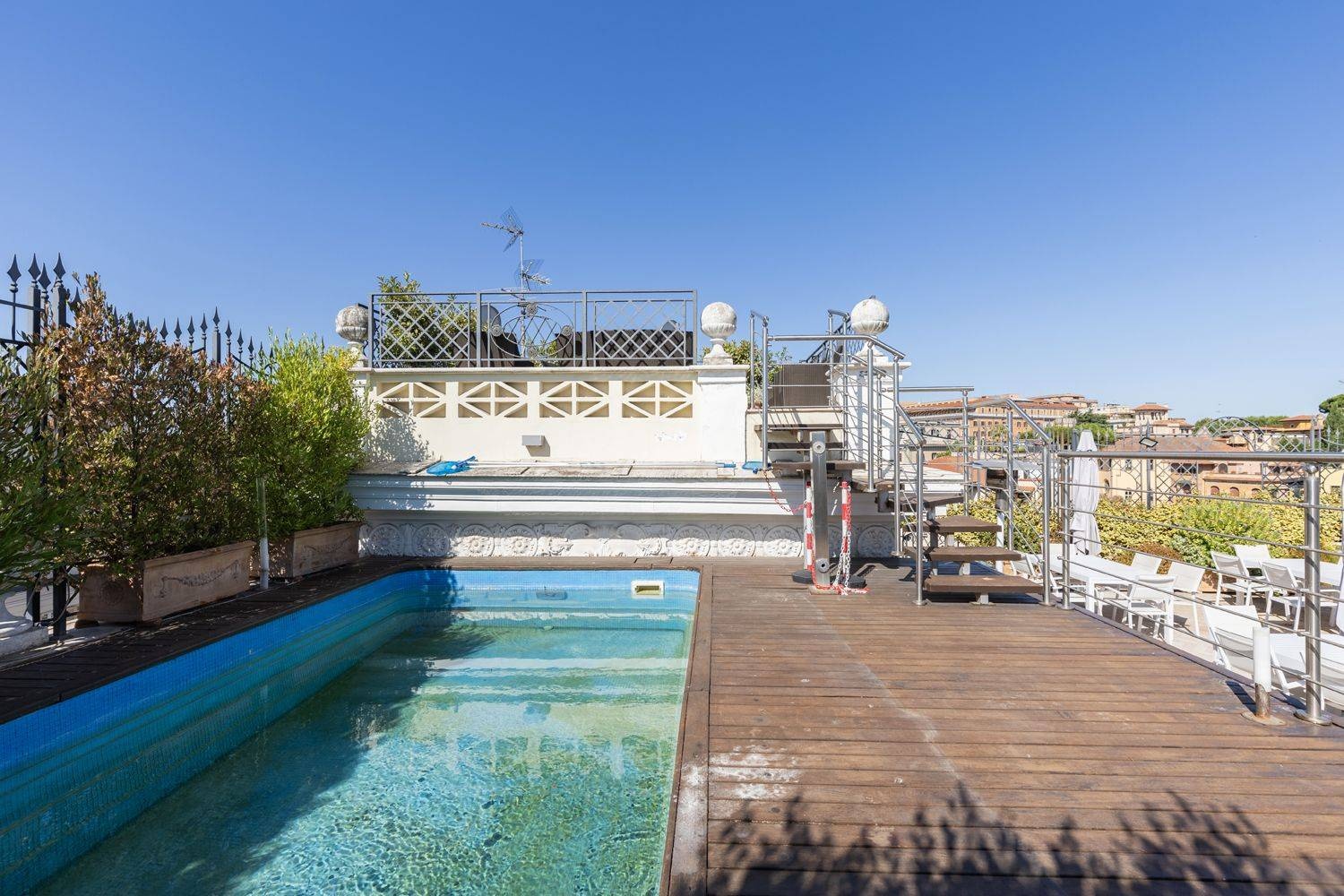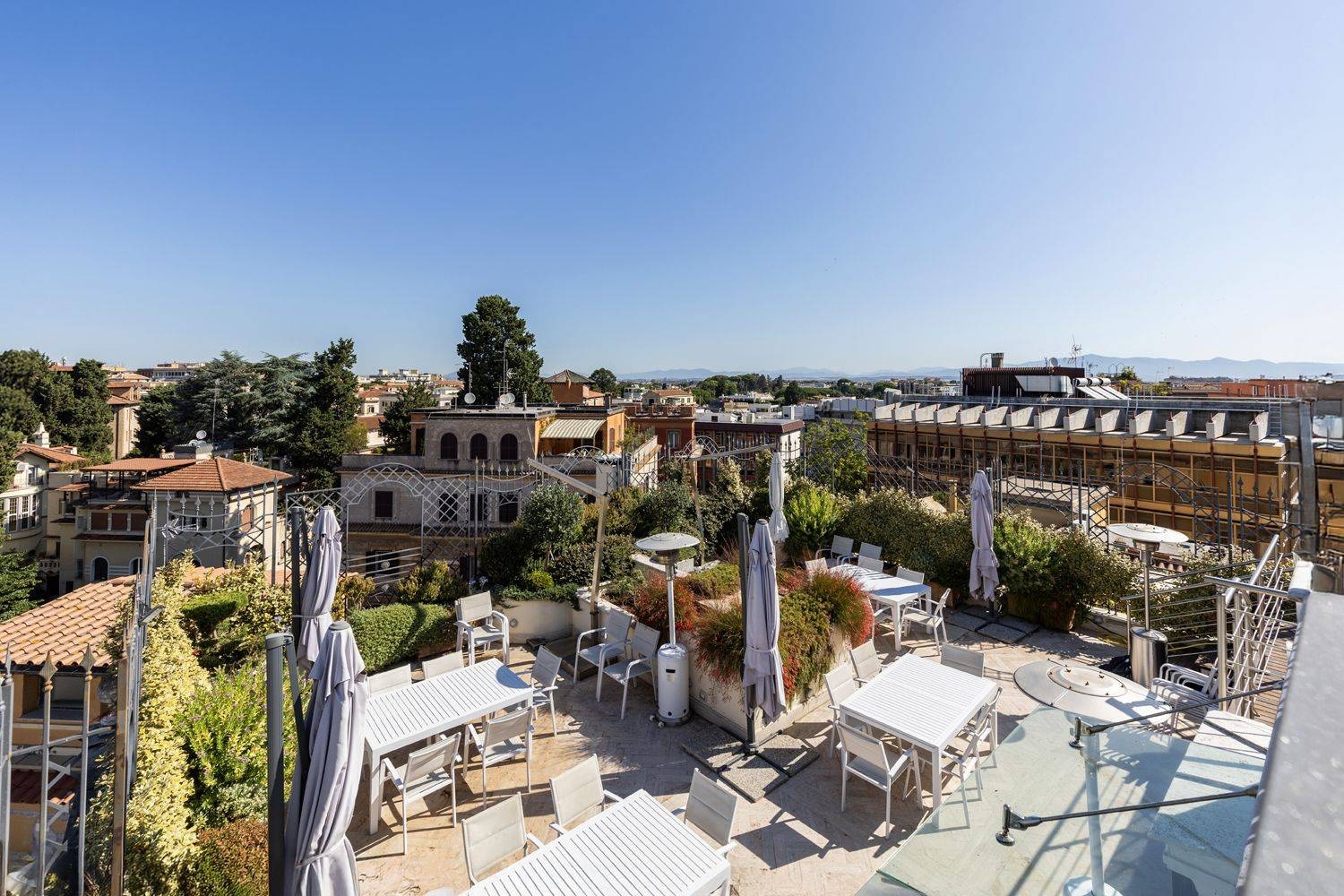 The internal layout is both functional and elegant: the ground floor hosts executive offices and a prestigious meeting room, while the upper floors accommodate additional offices, reception areas, and operational spaces designed to ensure comfort and efficiency. The top floor is conceived as a charming residential unit, featuring a refined living area, kitchen, two bedrooms, and multiple bathrooms, with direct access to an exceptional 190 sqm rooftop terrace complete with a Jacuzzi, offering breathtaking open views over the city of Rome.