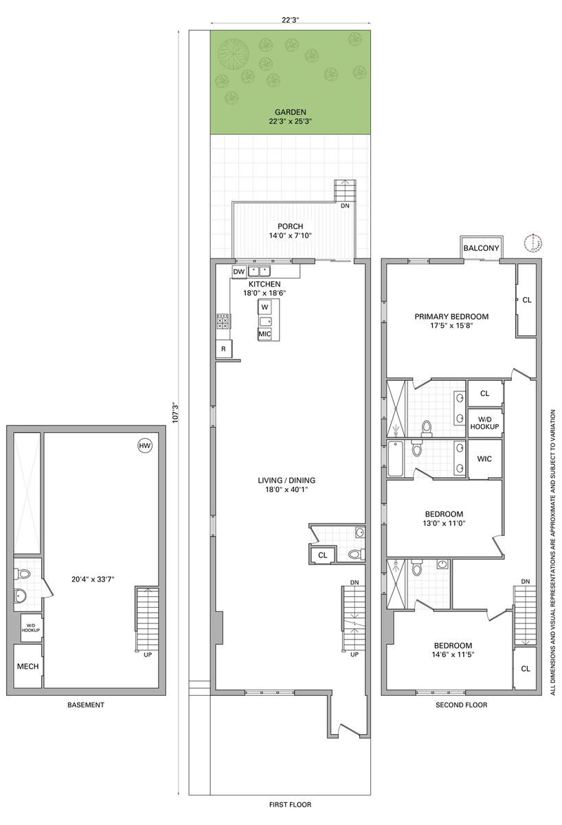 The main level also features a spacious chef’s kitchen, ideal for culinary enthusiasts. Outfitted with Taj Mahal countertops and backsplash, an induction range with pot filler, an integrated French-door refrigerator and dishwasher, and an oversized island that comfortably seats four, the kitchen is designed for both functionality and style. Its thoughtful layout allows for easy movement while cooking or entertaining. With direct garden access just off the kitchen, it’s perfectly suited for al fresco dining on the deck or in your private garden with friends and family. A conveniently located powder room off the main living area completes this level.