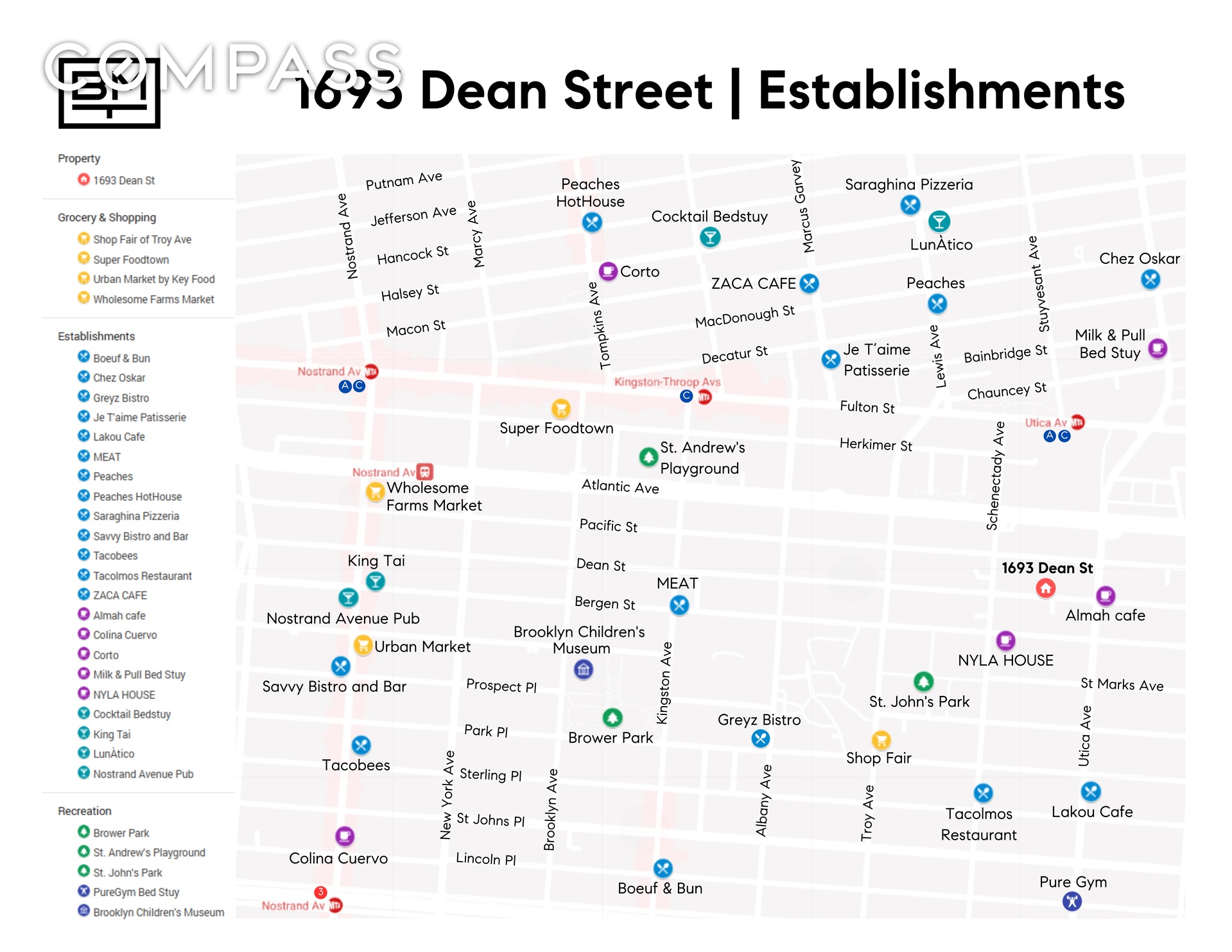 Enjoy close proximity to neighborhood cafes, restaurants, and cultural attractions, including Almah Cafe, Nana Ramen, Laziza, Chez Oscar, St. John’s Park and the Brooklyn Children’s Museum. Convenient access to the A/C subway lines at Utica Avenue, along with the B15 bus with service to JFK via the AirTrain, makes commuting seamless.