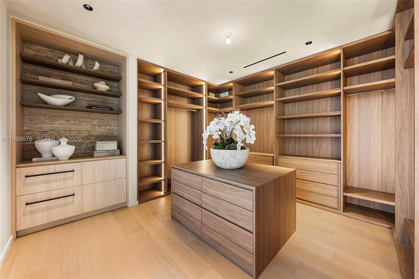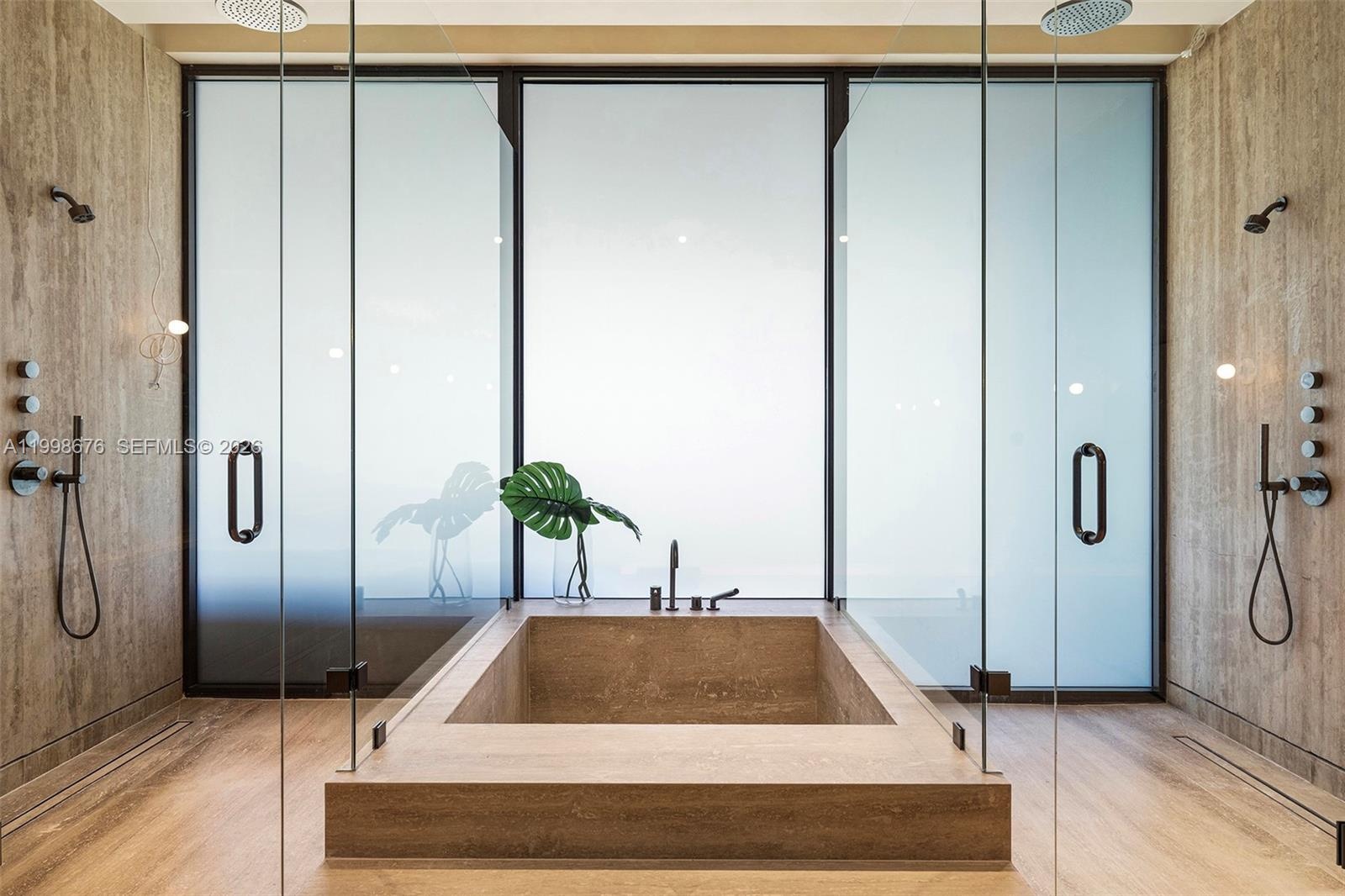 The private upper level is devoted to a serene primary suite with sitting area, spa-like travertine bath, expansive closets, coffee station, and a dedicated wellness suite with sauna and cold plunge.