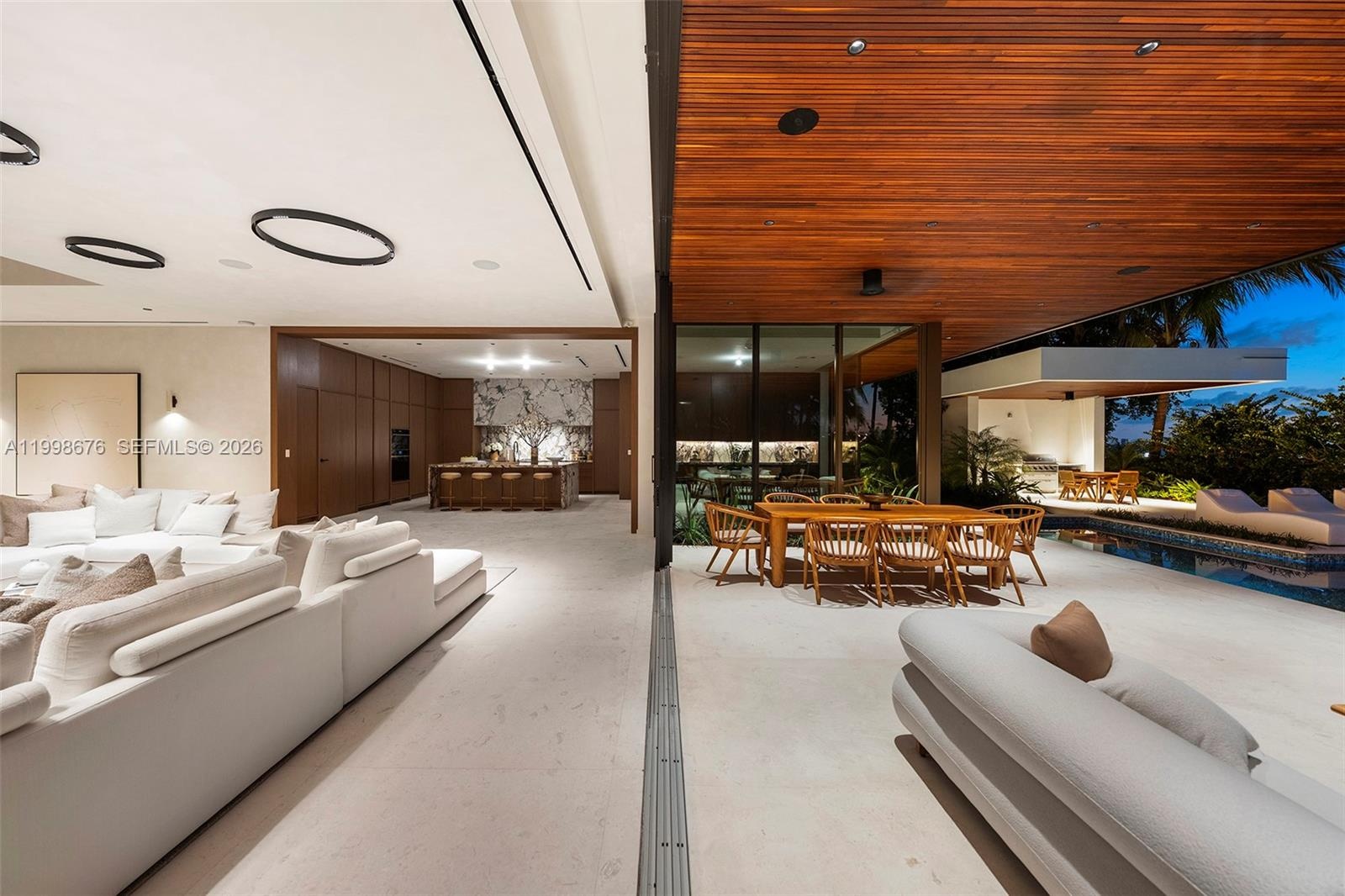 Designed by SDH Studio, with interiors by Alizée Brion and landscape design by CLAD, the home blends refined natural materials with sophisticated modern living. Elevated above FEMA requirements, it features soaring ceilings, dramatic entertaining spaces, custom walnut millwork, shell stone and white oak flooring, limestone accents, Lutron lighting and shade control, Sonos-integrated audio, and seamless indoor-outdoor living.