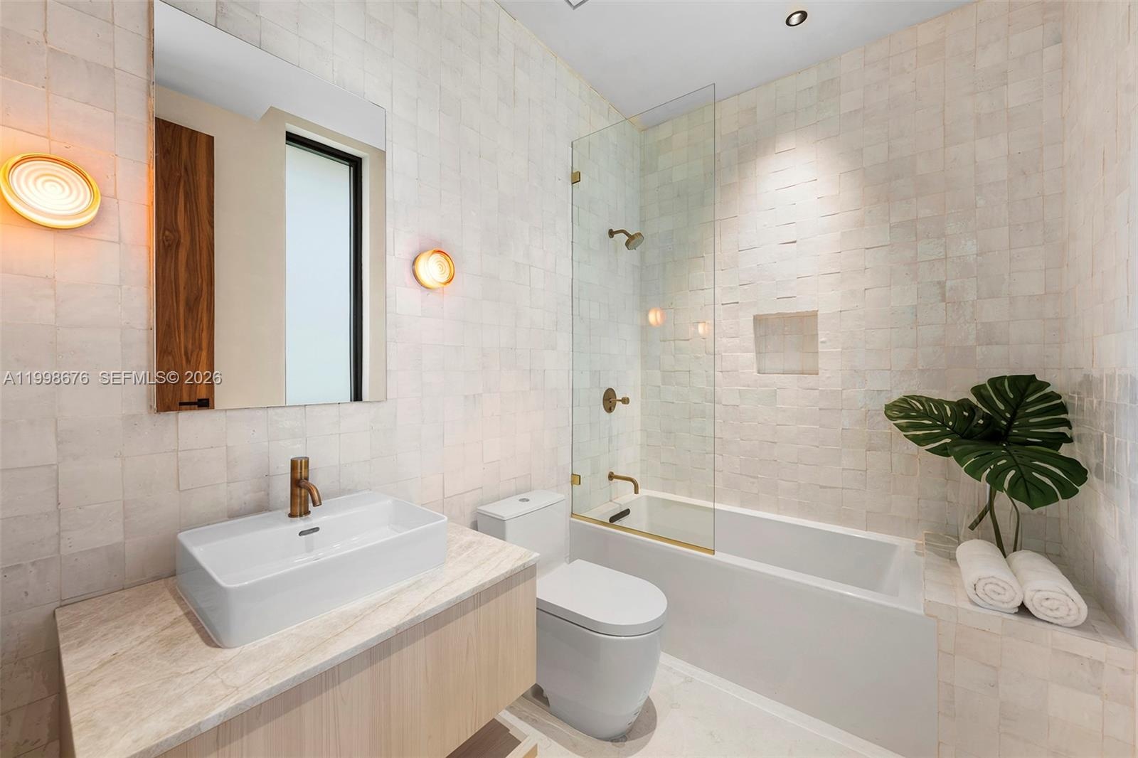 The home includes a stunning main kitchen, fully equipped chef’s kitchen, heated saltwater pool and spa, waterfall feature, outdoor kitchen, lush tropical landscaping, and a spectacular 2,250 SF rooftop terrace with pickleball rendering.