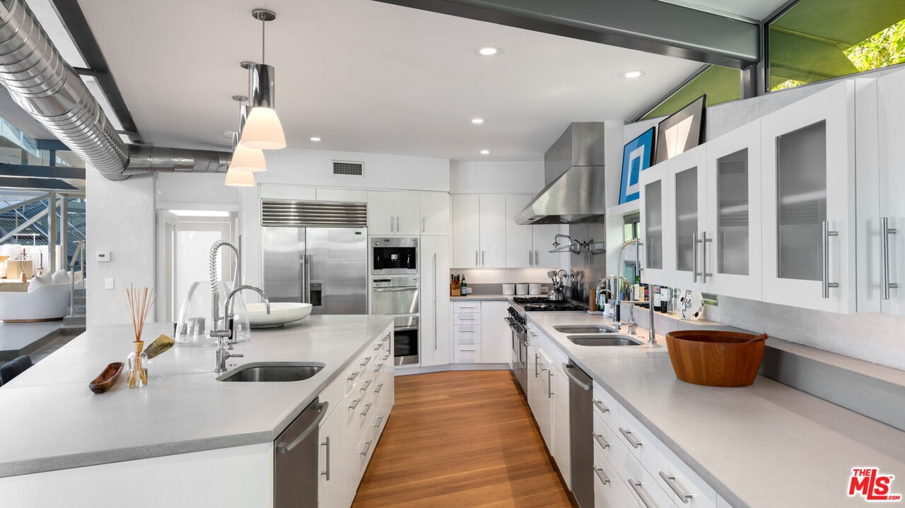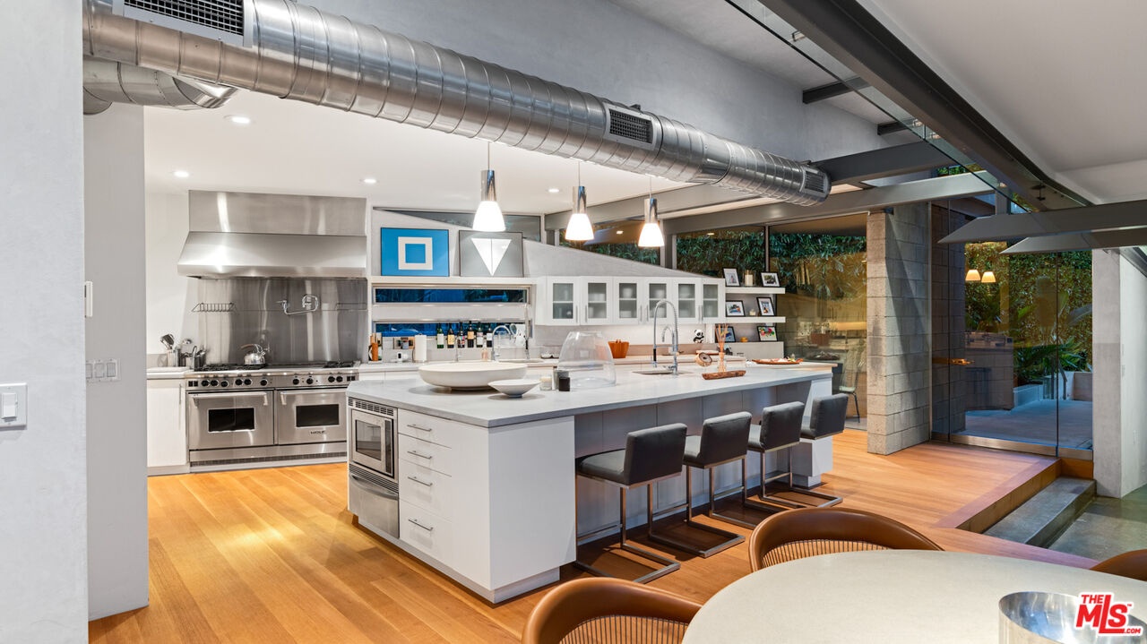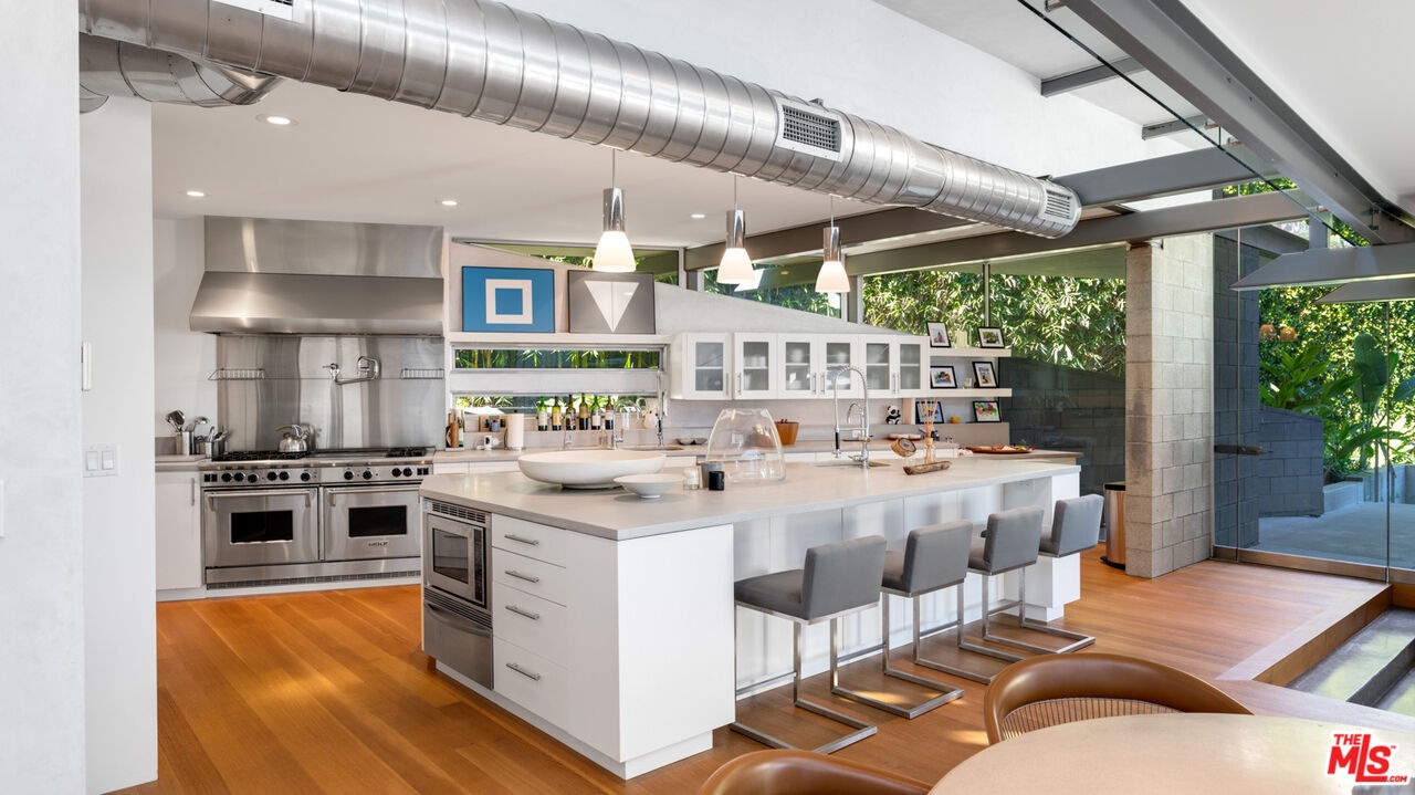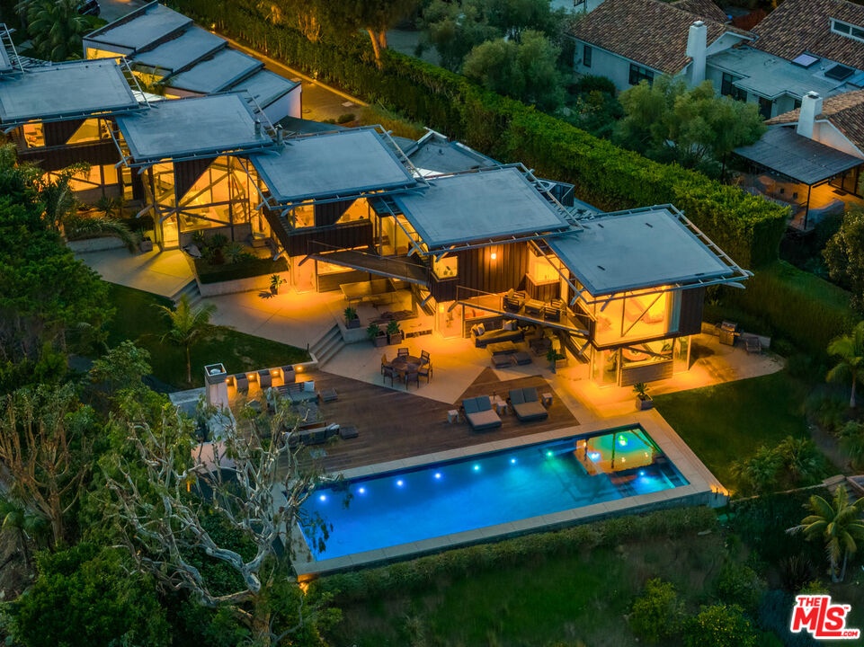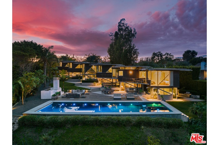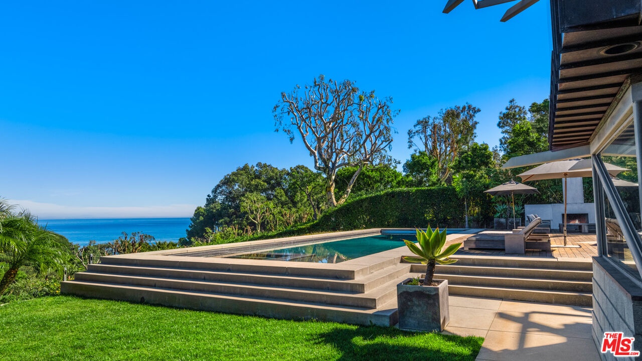 Ocean views, lush natural light, and dramatic angles animate the spacious interiors of this spectacular architectural estate. Designed by renowned architect Bart Prince in a series of interconnected modules, the home follows the contours of a gently terraced gated property of over an acre. With a guest house, pool, expansive landscaped grounds, and Riviera 3 beach key, this singular residence is an entirely original Point Dume retreat. The generous use of structural steel, soaring ceilings, walls of glass, polished concrete floors, and lustrous wood create welcoming spaces that seem to erase the boundary between indoors and out. Contemporary lines and exceptional layout provide settings for comfortable living and inspired entertaining. Two living rooms, a family room, and a dining room with a fireplace all offer tantalizing views of the very private grounds, where patios and gardens suggest congenial gatherings, barbecues, and undisturbed relaxation. The kitchen is a majestic achievement, with maple floors, granite countertops, top-of-the-line built-in appliances, a large island with bar seating, a built-in desk, and a butler's pantry / catering kitchen with additional appliances and a door to the side yard. An en-suite bedroom/gym/office with backyard and pool views completes the main floor. On the upper floor, where rooms are connected by a long catwalk, there is an ocean-view office with a fireplace, plus three en-suite bedrooms, including the primary. This lavish private getaway has very high ceilings and stunning pool and ocean views, plus walk-in closets and a sublime ocean-view bathroom. In addition to the main house, there is a one-bedroom guest house with a living room and a full kitchen. At the front of the house, there is a lush, private yard with ample space for relaxing and entertaining. The grand-scale ocean-view backyard offers a variety of settings for outdoor dining and lounging, including a covered dining deck, an outdoor living room, a large fireplace, lawn, sauna, large swimming pool, and ocean-view pathways that meander among a fruit orchard with private steps that descend to the beach below. The gated property is served by two driveways, one leading to the four connected, glass-door garage bays, one with a full bath. Additional features include seven-zone climate control and air conditioning, heated concrete floors, and security system. This is a remarkable architectural estate of bold design in a marvelous setting.