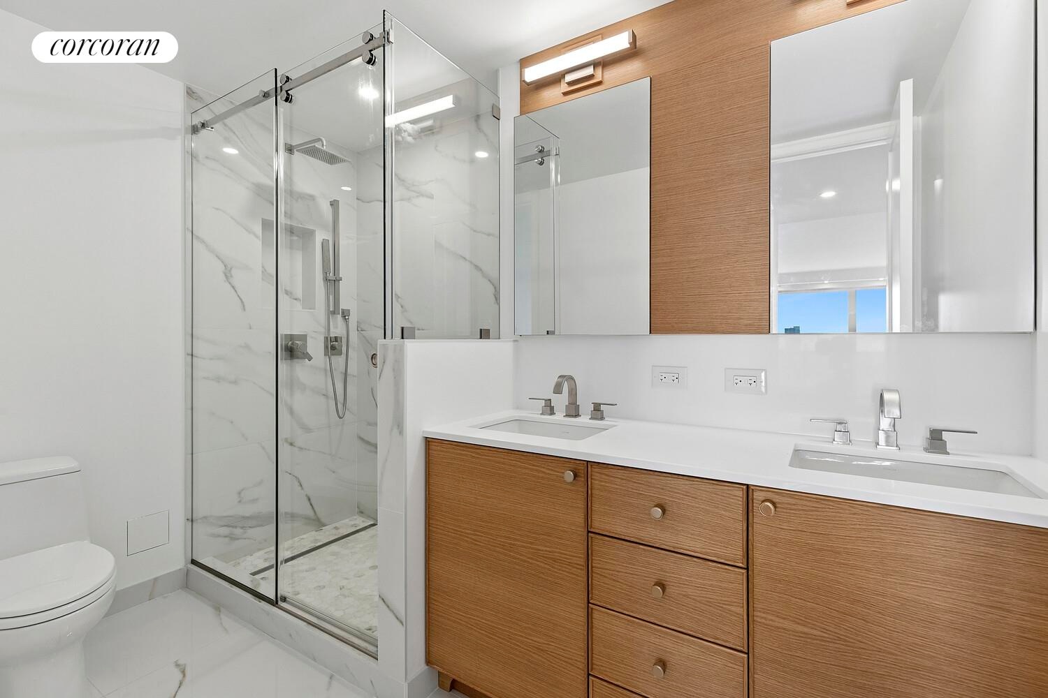 The primary suite includes a large, fitted walk-in closet and a spa-like en-suite bath with custom double vanity, custom recessed medicine cabinet, a glass-enclosed walk-in shower with body sprays, and a heated floor.