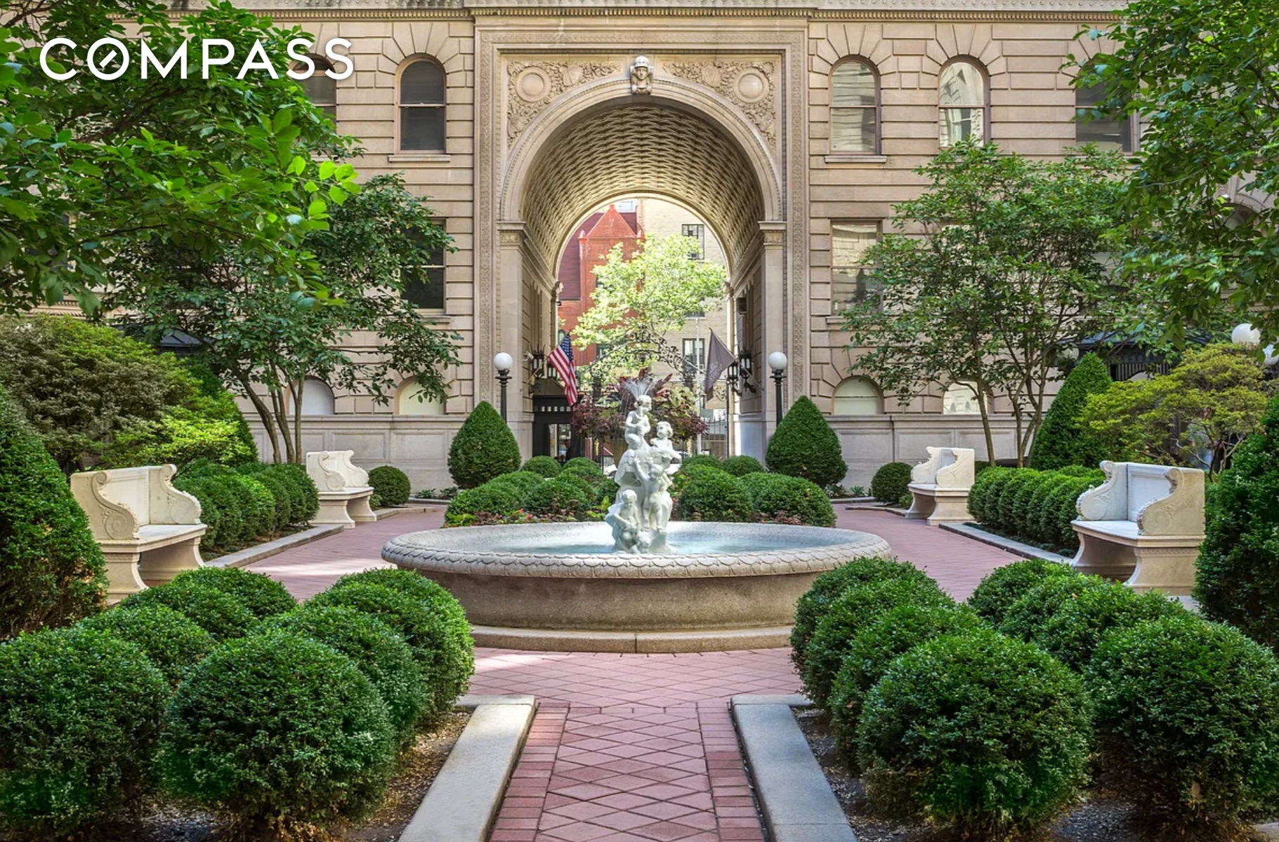 The dining room offers a more intimate atmosphere, centered around the second fireplace and overlooking the building’s iconic landscaped courtyard and central fountain - an inward-facing perspective that brings a sense of calm and privacy rarely found in Manhattan.