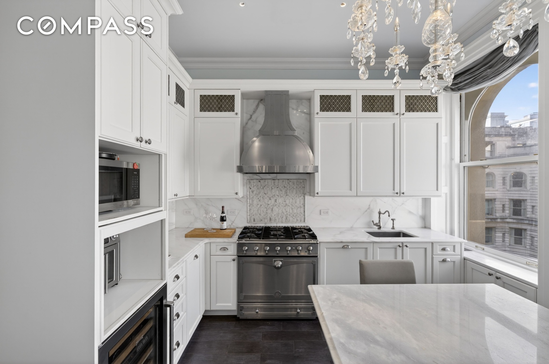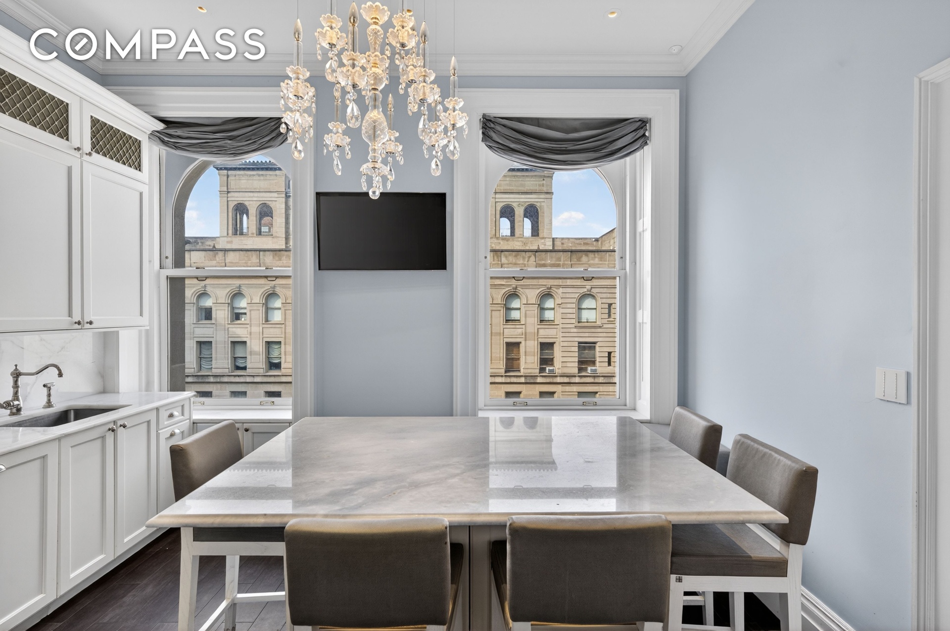 The fully renovated eat-in kitchen is designed with both performance and aesthetics in mind. Outfitted with a La Cornue range, Sub-Zero refrigeration and wine storage, custom Vent-A-Hood, and a five-burner configuration, it delivers a professional-grade culinary experience. Two large courtyard-facing windows introduce natural light and a tranquil backdrop.