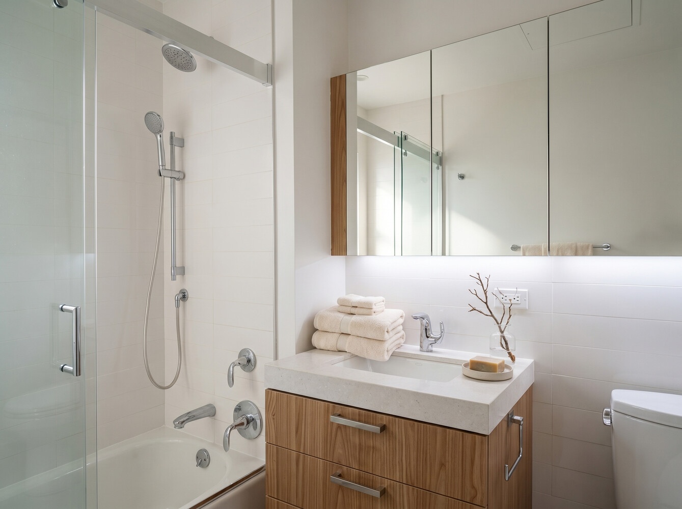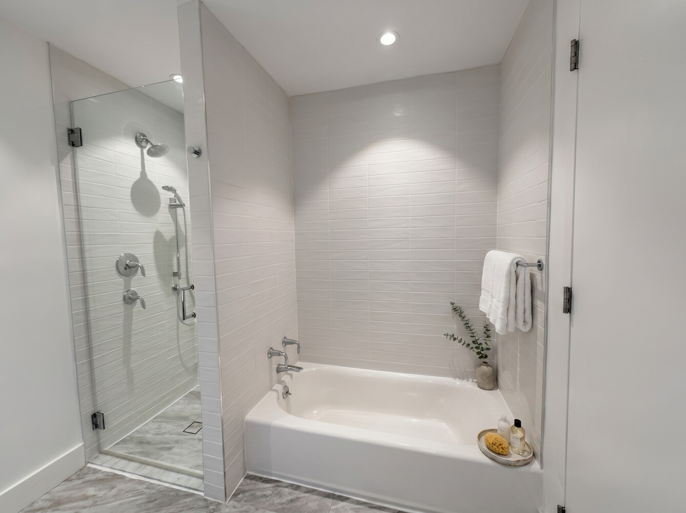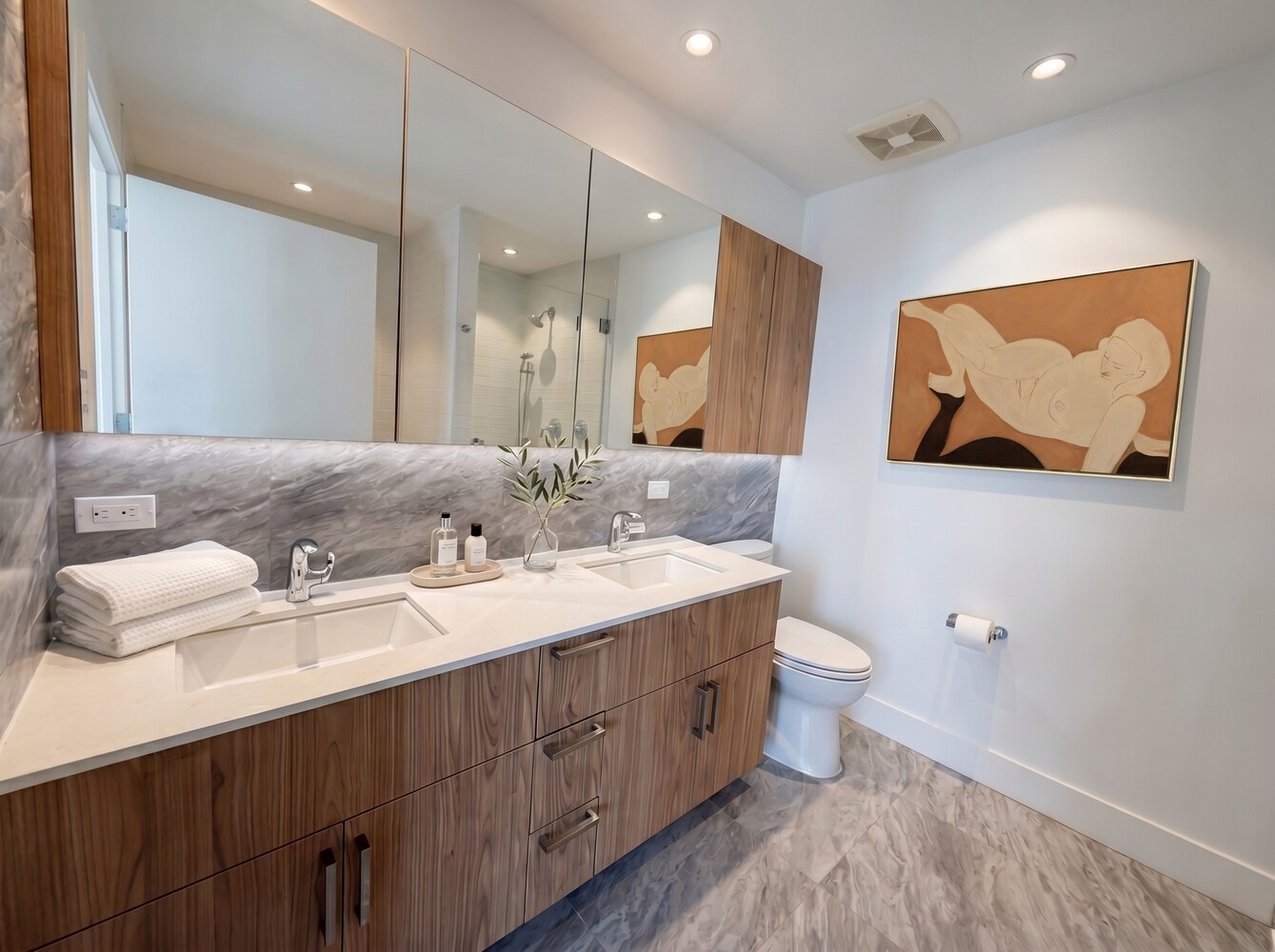 The serene bathrooms are finished with custom vanities, Quartz surfaces, Kohler fixtures, and a sophisticated blend of grey and white ceramic and porcelain tile. A Bosch washer and dryer complete the home, offering seamless convenience.