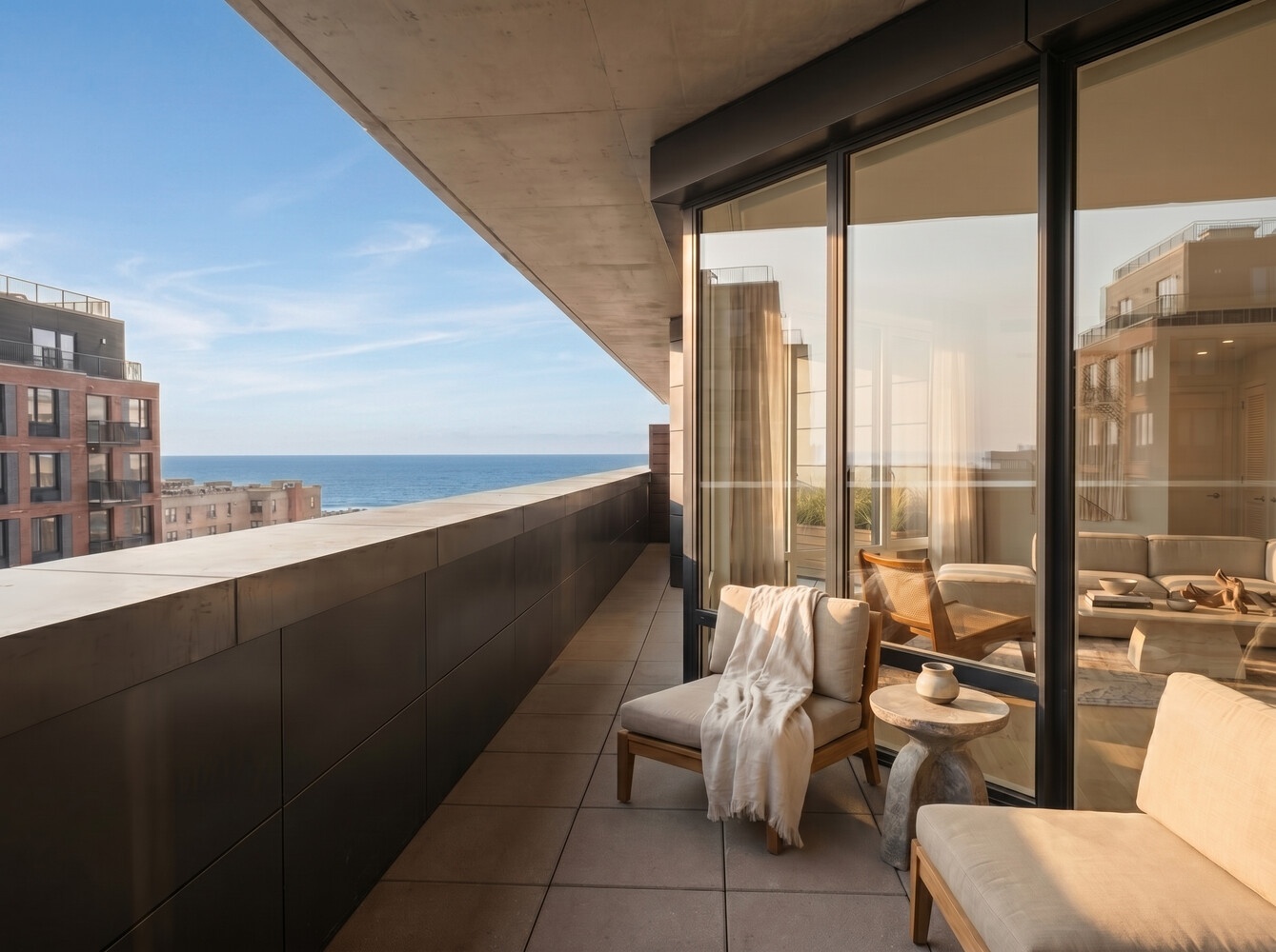 A standout feature is the expansive 346-square-foot private terrace, where sweeping beach and bay views provide the perfect backdrop for morning coffee or evening gatherings.