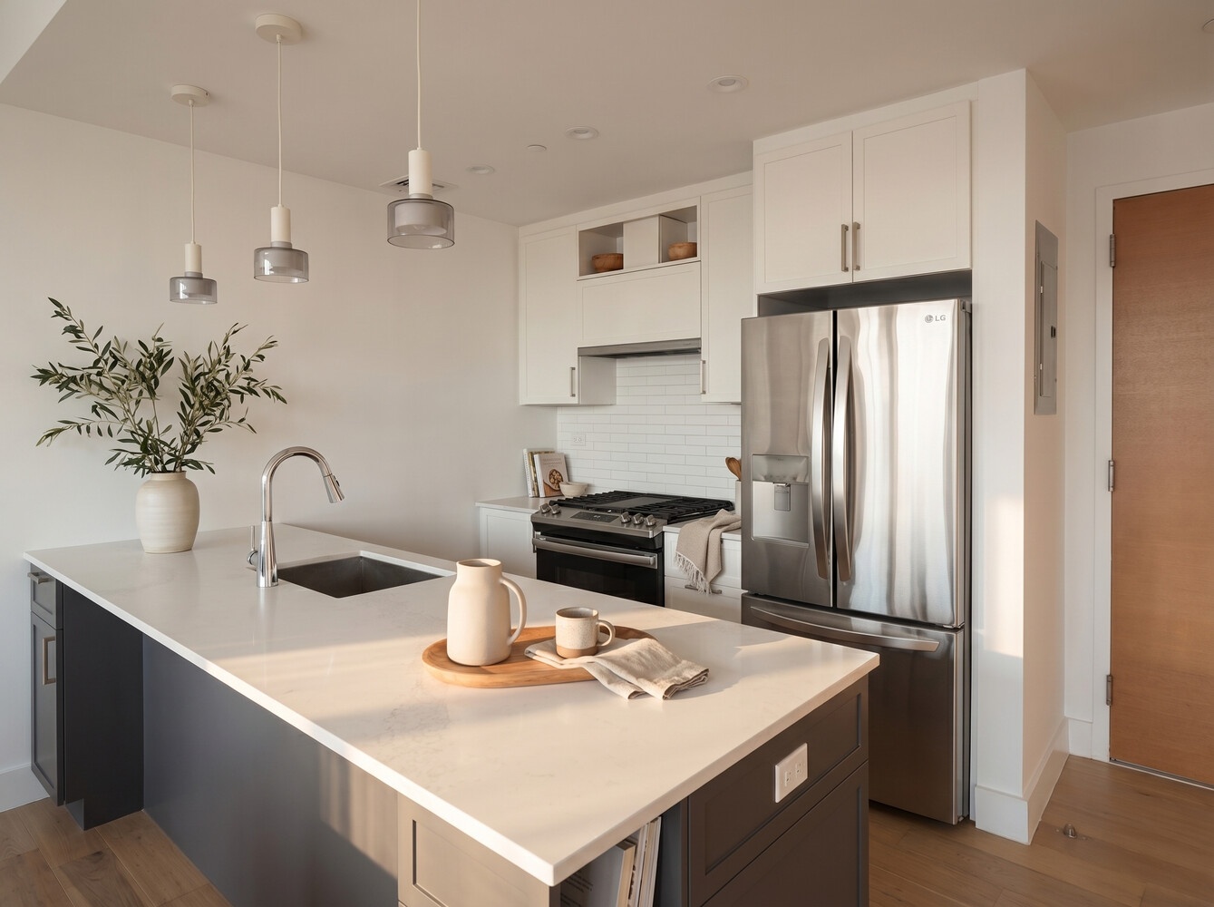 The open kitchen is thoughtfully designed with both style and functionality in mind, showcasing stainless steel appliances, custom grey-and-white cabinetry, Quartz countertops, and a glazed ceramic backsplash.