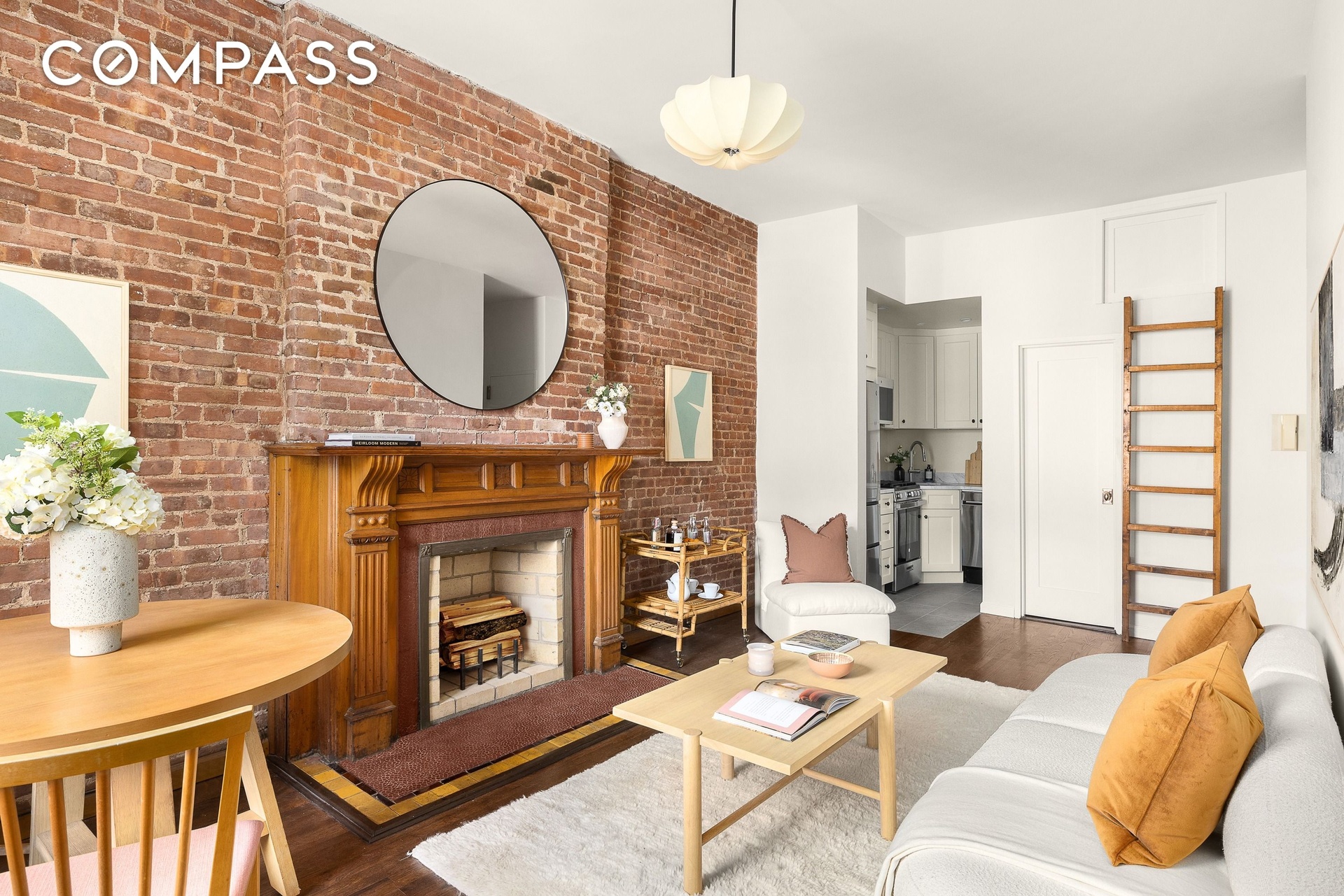 On the third floor of a charming brownstone co-op comes this fully renovated one-bedroom home with exposed brick, espresso-stained hardwood floors, and an original fireplace that sets the tone before you even set down your keys. There’s an easy warmth to this home that you feel the moment you enter, some homes try to manufacture character, this one has it built into the walls.