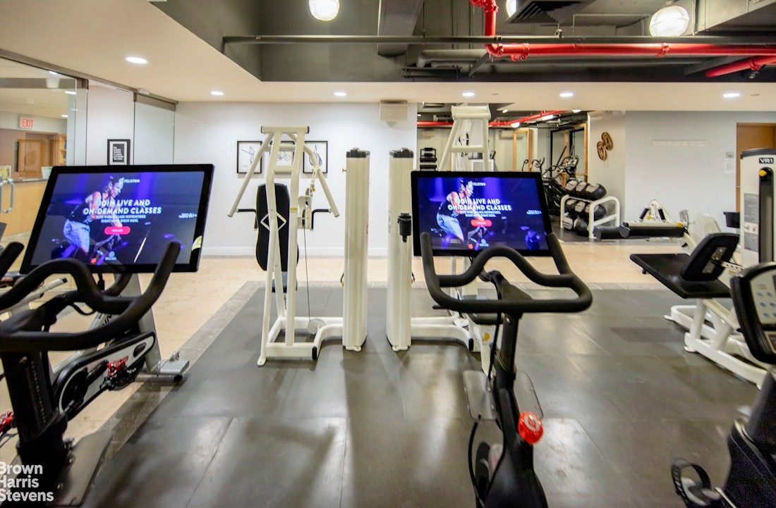 The Ariel is a white glove service condominium with both a doorman and concierge. It features a fully equipped, attended fitness center, and yoga/Pilates studio with 14 free of charge fitness classes per week, a 51 foot indoor swimming pool, men's' and women's' locker rooms with steam, indoor and outdoor play area, and a basketball court. Across the street at the sister Ariel East building, residents can use the large party room which has a grand piano, screening room and full catering kitchen.
