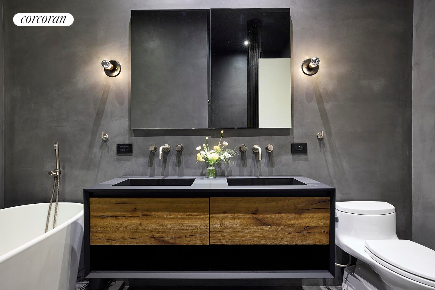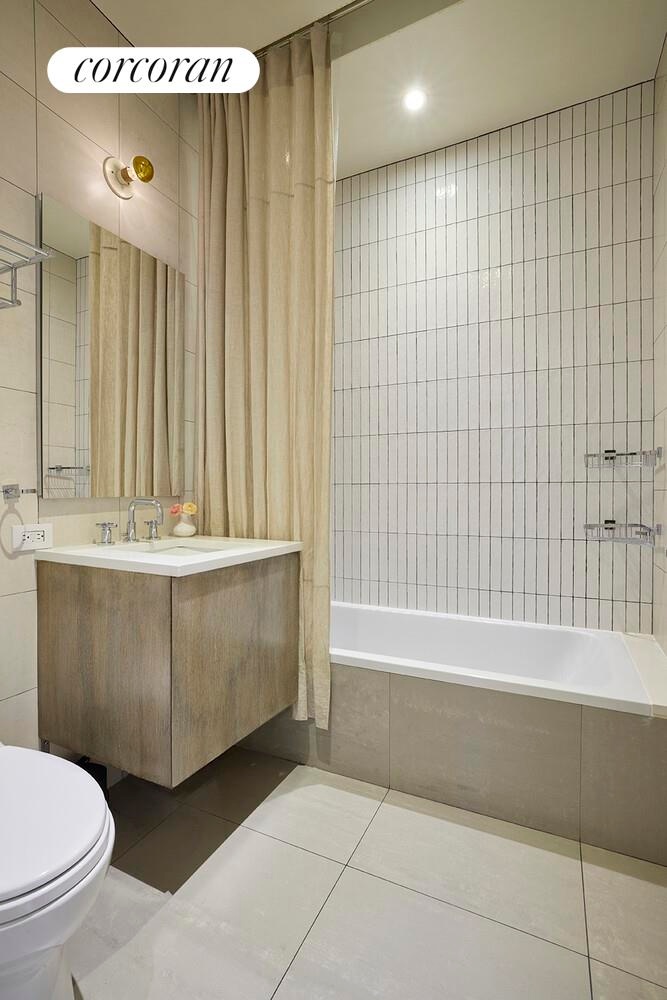 Two additional bedrooms enjoy southern and western exposures and are complemented by a meticulously designed guest bath featuring floor-to-ceiling tilework and a deep soaking tub.