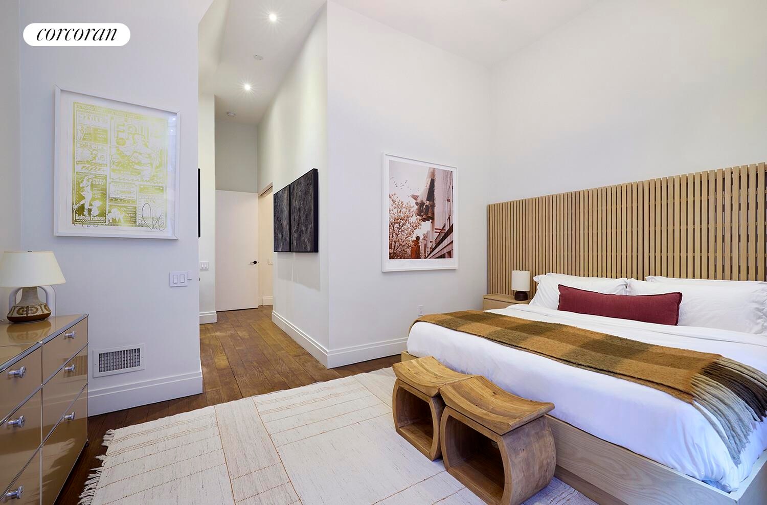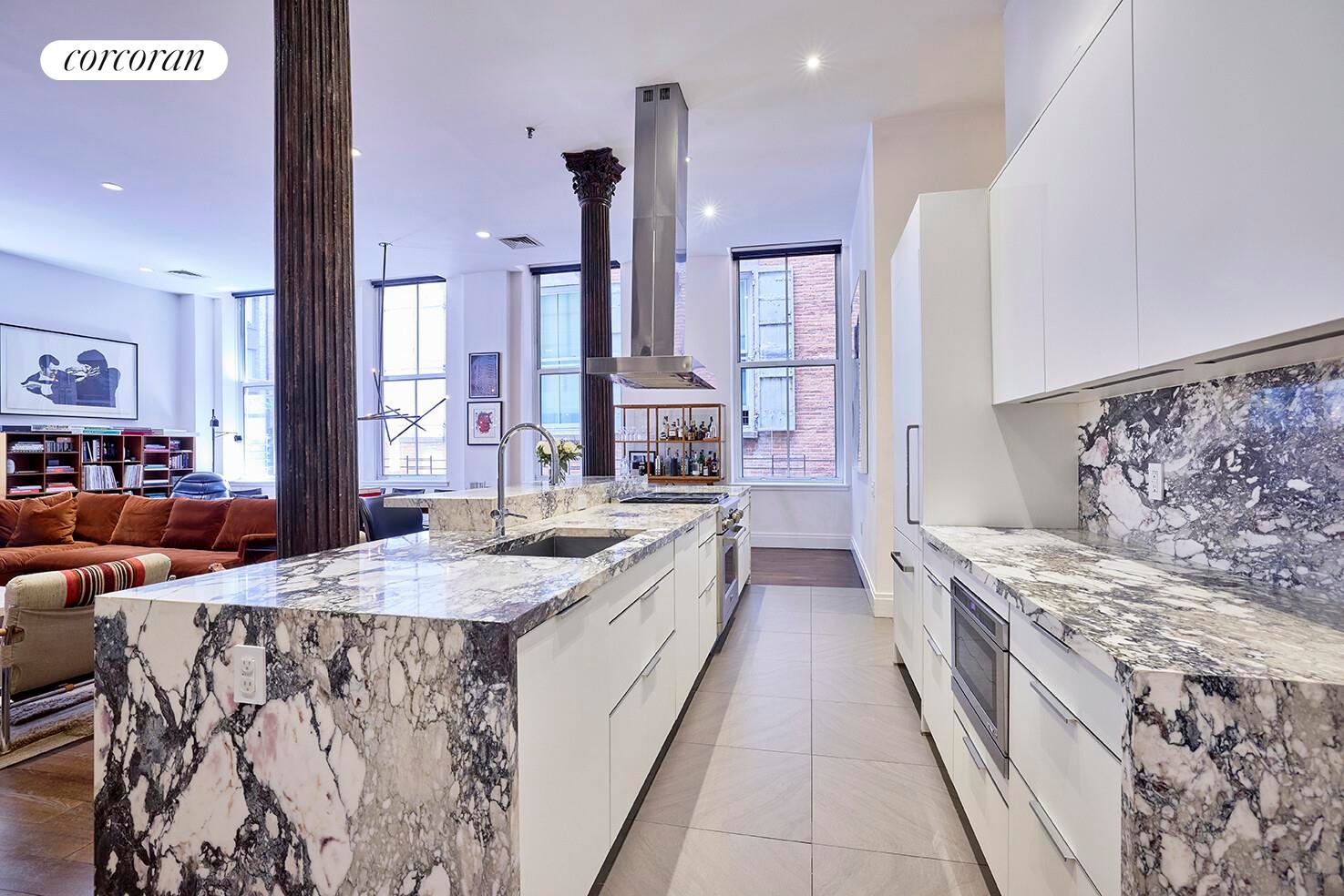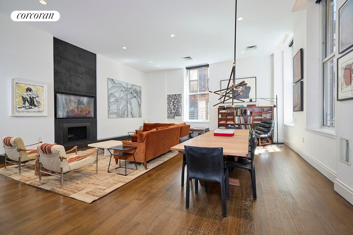 Nine oversized windows with eastern, southern, and western exposures bring in beautiful natural light. The residence offers an extraordinary sense of volume and airiness, enhanced by soaring 13-FOOT CEILINGS , original cast-iron columns, and newly installed motorized shades. The expansive great room is both dramatic and inviting, anchored by a bespoke fireplace with a Pierre Blue stone hearth-an elegant focal point for grand entertaining and everyday living.