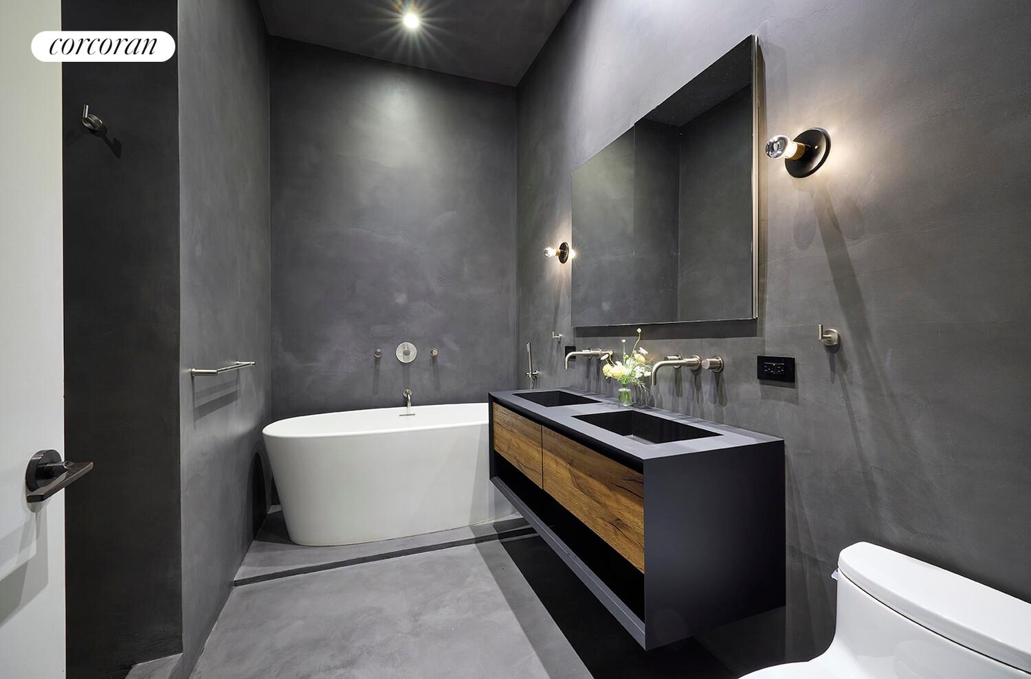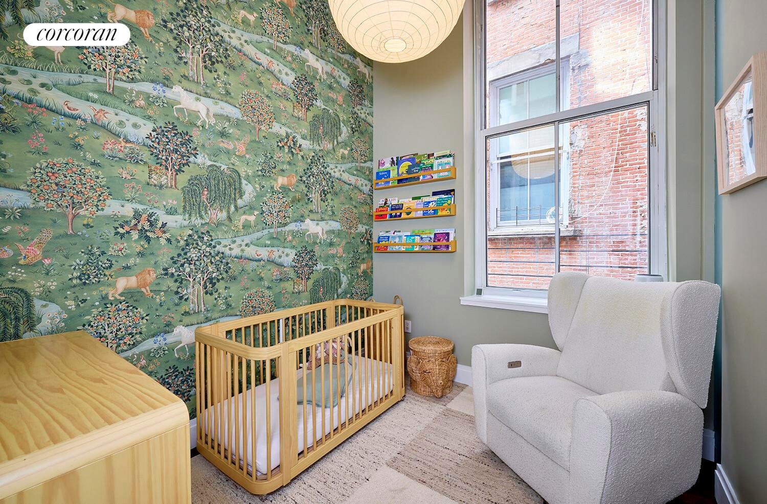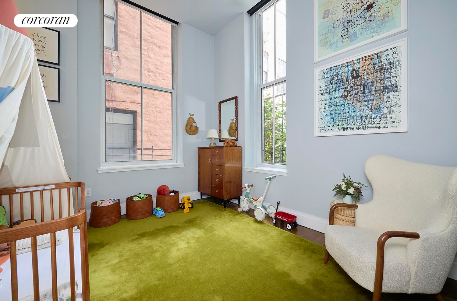 Nine oversized windows with eastern, southern, and western exposures bring in beautiful natural light. The residence offers an extraordinary sense of volume and airiness, enhanced by soaring 13-FOOT CEILINGS , original cast-iron columns, and newly installed motorized shades. The expansive great room is both dramatic and inviting, anchored by a bespoke fireplace with a Pierre Blue stone hearth-an elegant focal point for grand entertaining and everyday living.