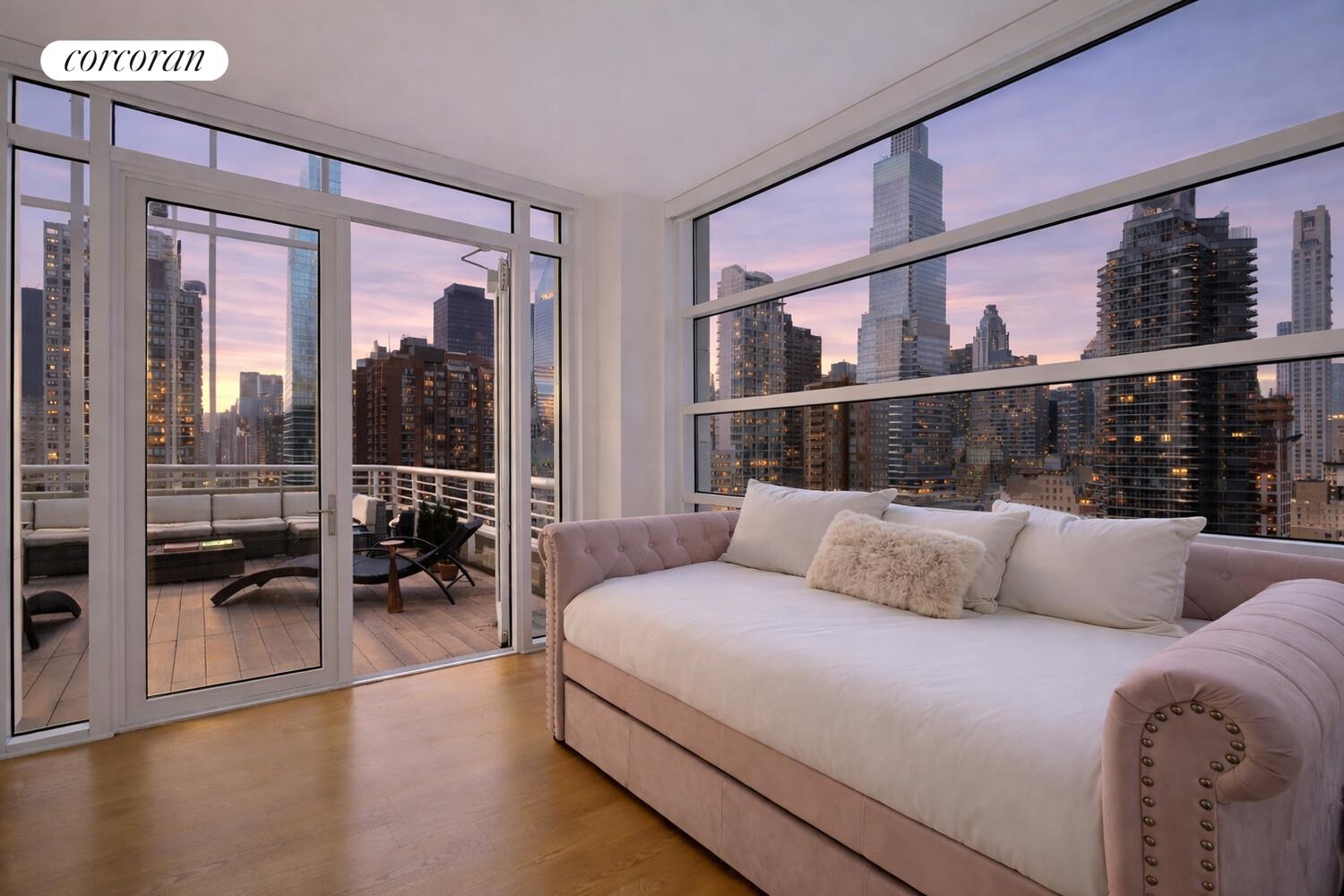 Chefs will gravitate towards the open gourmet kitchen featuring sleek Scandinavian custom cabinetry, rich marble, and a fleet of upscale Gaggenau and Miele appliances. The massive waterfall island is the perfect perch for casual meals and conversation overlooking the East River and 59th Street Bridge. A secondary suite on this level offers terrace access, making it ideal as a study, home office or guest accommodation. Head upstairs to discover the home's crowning glory - a glorious roof deck with breathtaking views that stretch across the city skyline.