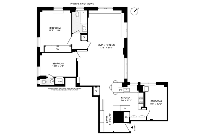 Anchoring the home is the expansive 27-foot long living and dining room, spanning the full width of the apartment. With ample room for both formal dining and comfortable living, the space is enhanced by custom built-ins and partial Hudson River views. This vast space may be used in many ways to incorporate a media room, den, additional bedroom space on the western side of the room or enjoyed as the open loft room as it is today.